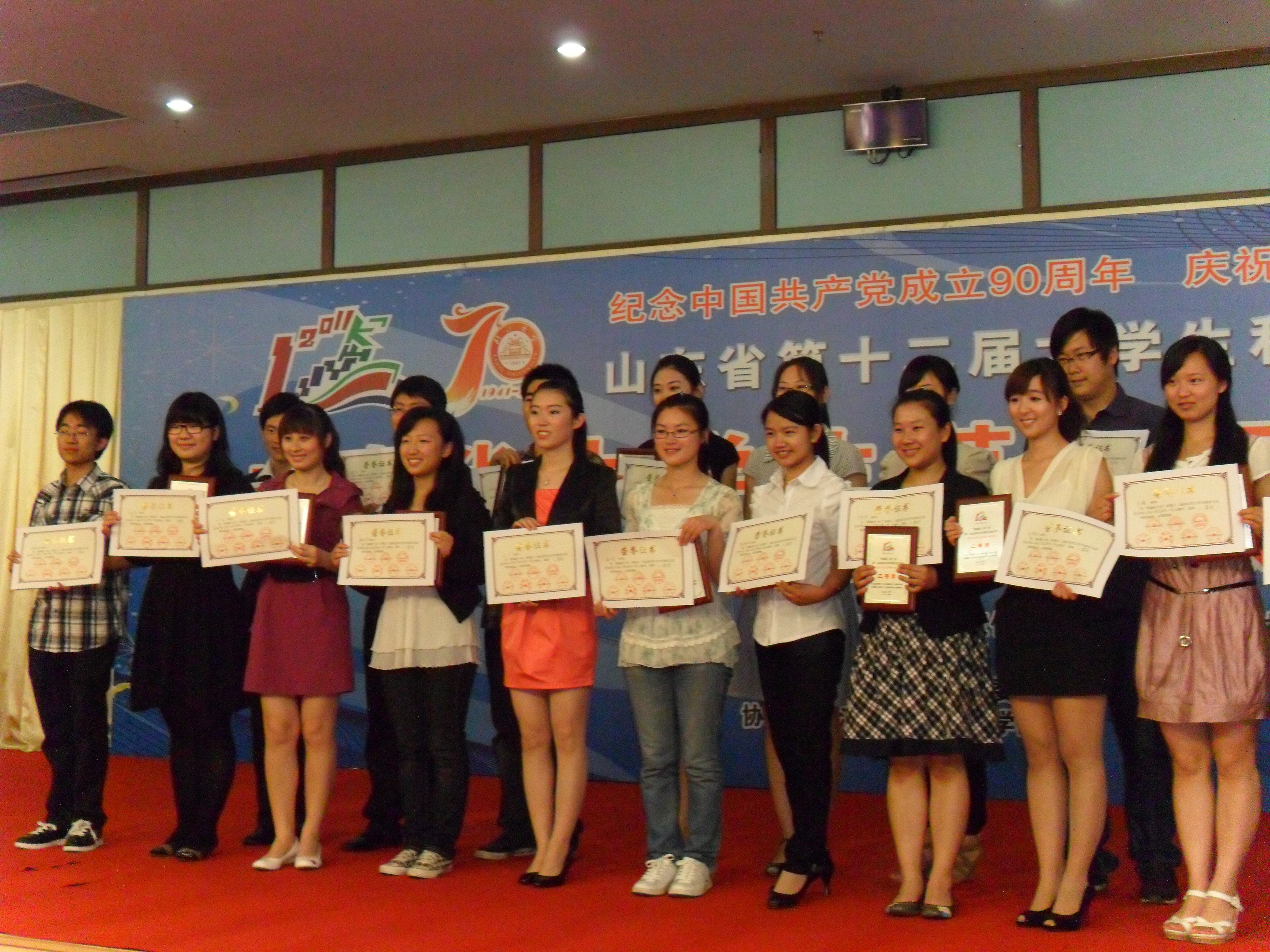 为庆祝中国共产党成立90周年, 5月 28日 至29日,山东省第十二届大学生科技文化艺术节系列活动之山东省大学生英语口语大赛在临沂大学成功举行。我校共选派2名英语专业组选手参加比赛。在复赛阶段,两名选手与其他高校的选手同台竞技,通过定题演讲和即兴演讲,经过激烈角逐,丁爱华同学获得优秀奖,金欣同学成功晋级决赛。在决赛阶段,金欣同学凭借标准的发音、流利的表达、清晰的思路和扎实的文化知识功底,荣获二等奖,为学校争得了荣誉!