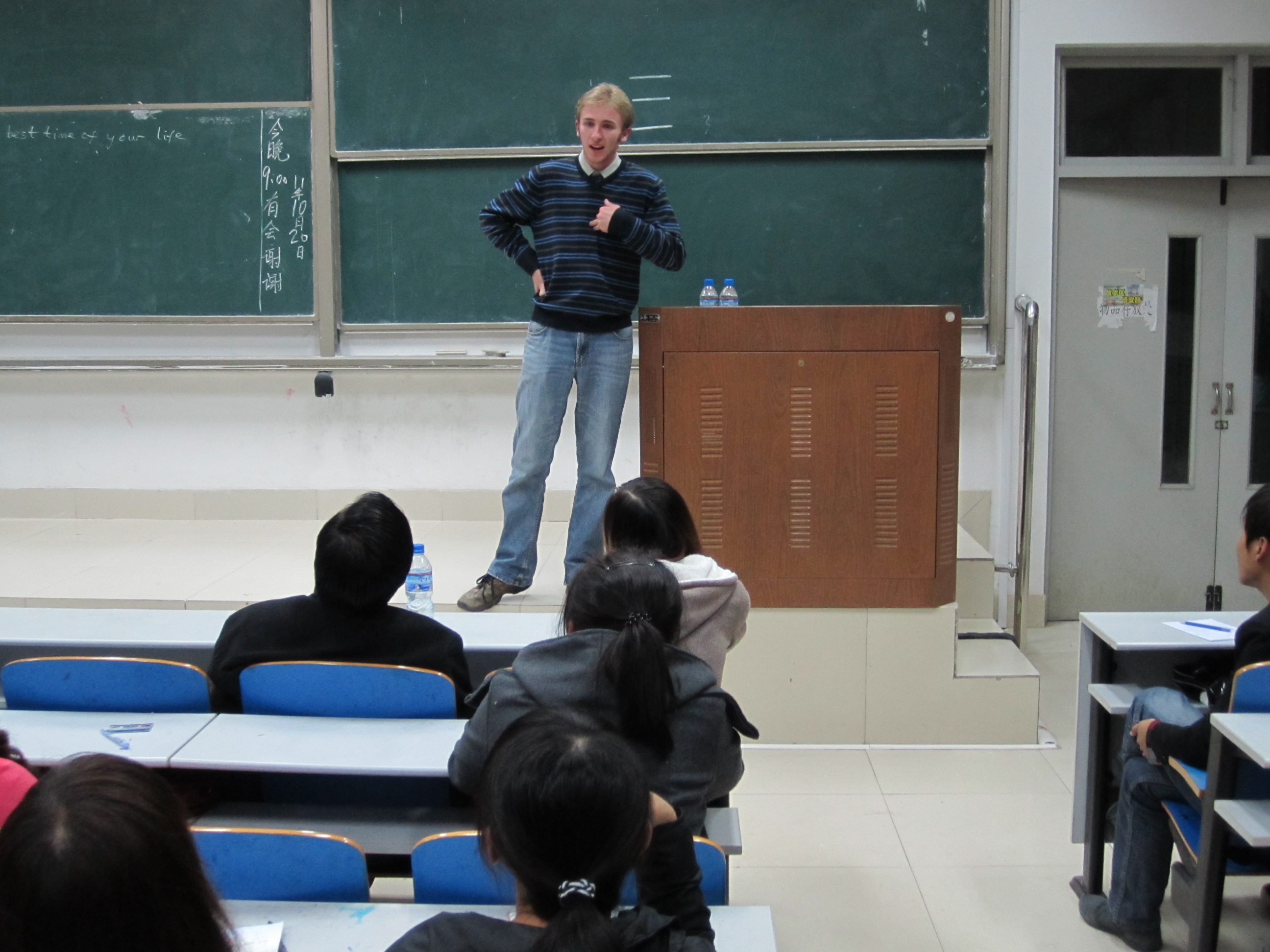 随后,外教Ben与同学们进行了交流。Ben首先提出“University is the best time of your life”(大学是你一生中最美好的时光),因为从大学开始人才渐渐尝试着独立,也是在大学里才有机会认识更多不同的人、经历更多的事,更是在大学里才有机会学到更多的东西。Ben结合自己与朋友在英国大学学习与毕业后工作的经历,告诫同学们要珍惜大学生活。同时,Ben又讲了自己对如何学好知识的见解,结合他在中国做家教的经历,Ben同样认为兴趣在学习中是很重要的。接着,Ben用辩证的思维又提出大学不应该是你一生中最美好的时光。因为假若如此,那么你的大学生活一定是失败的。他讲到,当你老了,躺在床上回想自己的一生,大学不应是最美好的,通过大学的努力而争取到的将来的生活才应是。并且,他希望同学们毕业之后也要勇于去尝试新东西,正如他来中国一样。
