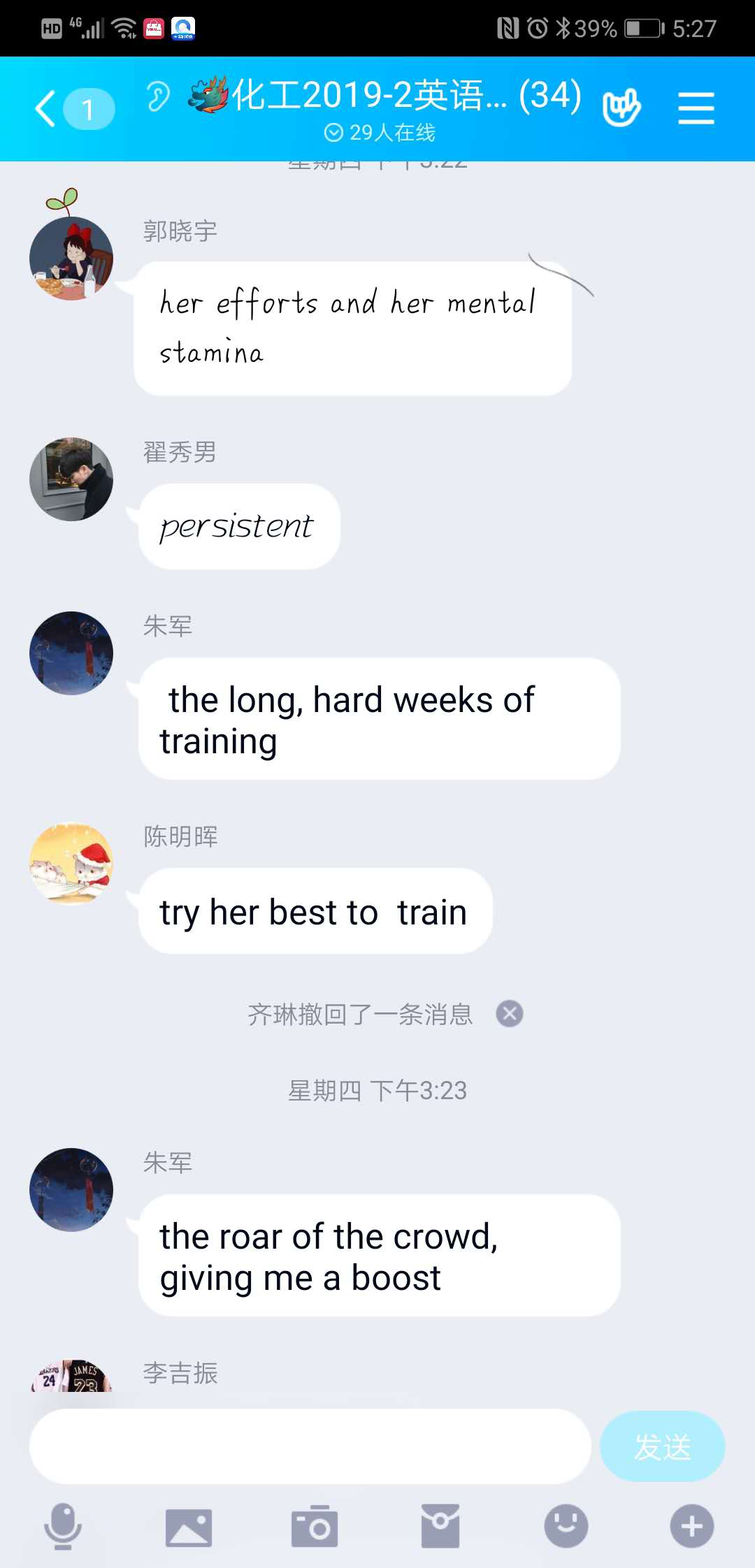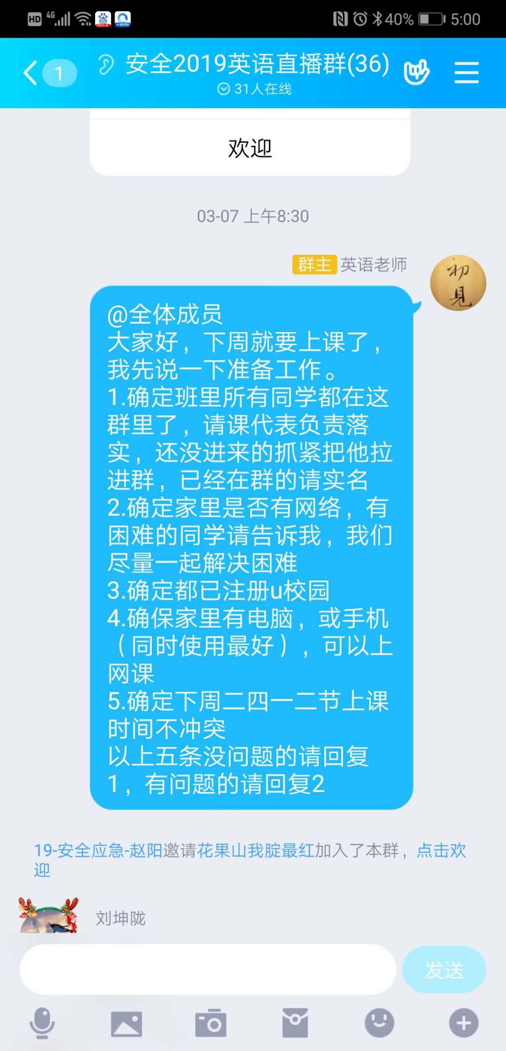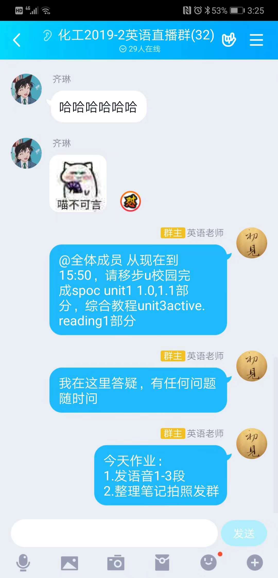 上课过程中吕艳老师采取了QQ屏幕分享直播+U校园+iWrite+在线答疑的四种教学形式。每次课完全按照课表安排的时间来进行,课前在班级QQ群里多次提醒学生上课时间,上课出勤率达到100%。吕艳老师一般会用一个半小时左右的时间,利用屏幕分享,给学生展示PPT,播放视频、音频等,直播课内容包括语音、课文讲解、翻译和作文反馈讲解等,剩下的时间让学生自主完成布置的U校园SPOC课程、综合教程以及视听说教程上的内容,老师在班级群在线答疑。每天布置作业,要求学生把朗读课文的录音音频发到班级群,当天上课的笔记整理拍照发班级群,老师给出反馈和指导,并借助于Iwrite在线写作系统布置作文,学生提交后老师给以反馈和讲评。每次上直播课吕艳老师都会录屏,将所讲内容录下来,放到班级群里,学生可以随时看回放。