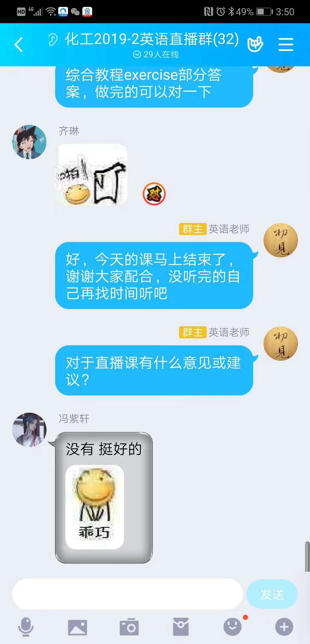 非在线直播授课时,吕艳老师也积极地跟学生交流,询问他们对空中课堂授课模式的意见和建议。学生总体反映良好,对这样的上课模式比较满意。当然,也有学生反映跟老师的互动不如在实际课堂上效果好,不能做到随时随地互动交流。针对这个问题,吕艳老师上课时有意识地增加了跟学生的互动交流,每讲一部分就停下来问问学生的理解情况,随机让学生连麦回答问题或在对话框里给出自己的答案,而不是只有老师一个人唱“独角戏”。