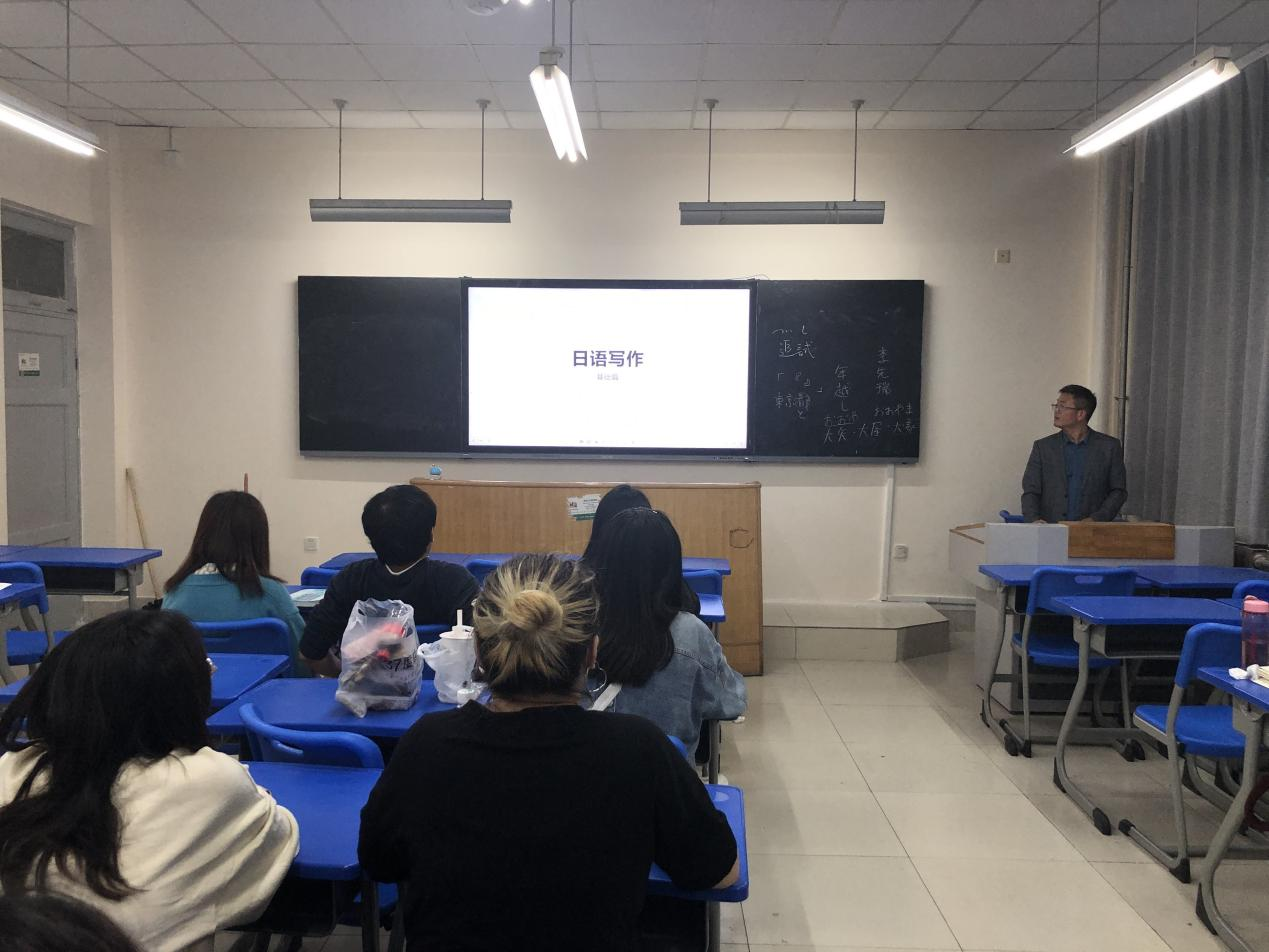 今天作为第一讲,孙老师主要以李先瑞老师的《日语基础写作》教材为参照进行展开,为同学们讲授了在日语基础写作中标点符号的用法、文体变化规则、口语与书面语转化的规律和直接、间接引用规则。他还借助短文改错的形式讲解了助词、词的形态、自动词他动词在日语基础写作中的应用,内容高度概括、通俗易懂、透彻入理。此外,本次讲座中孙老师还详细讲解了在日语基础写作中词与词的呼应、句末和接续表达等问题,他用直击重点的方式让备考的同学们明确了日语写作的方向,了解了把握考试内容的方法。