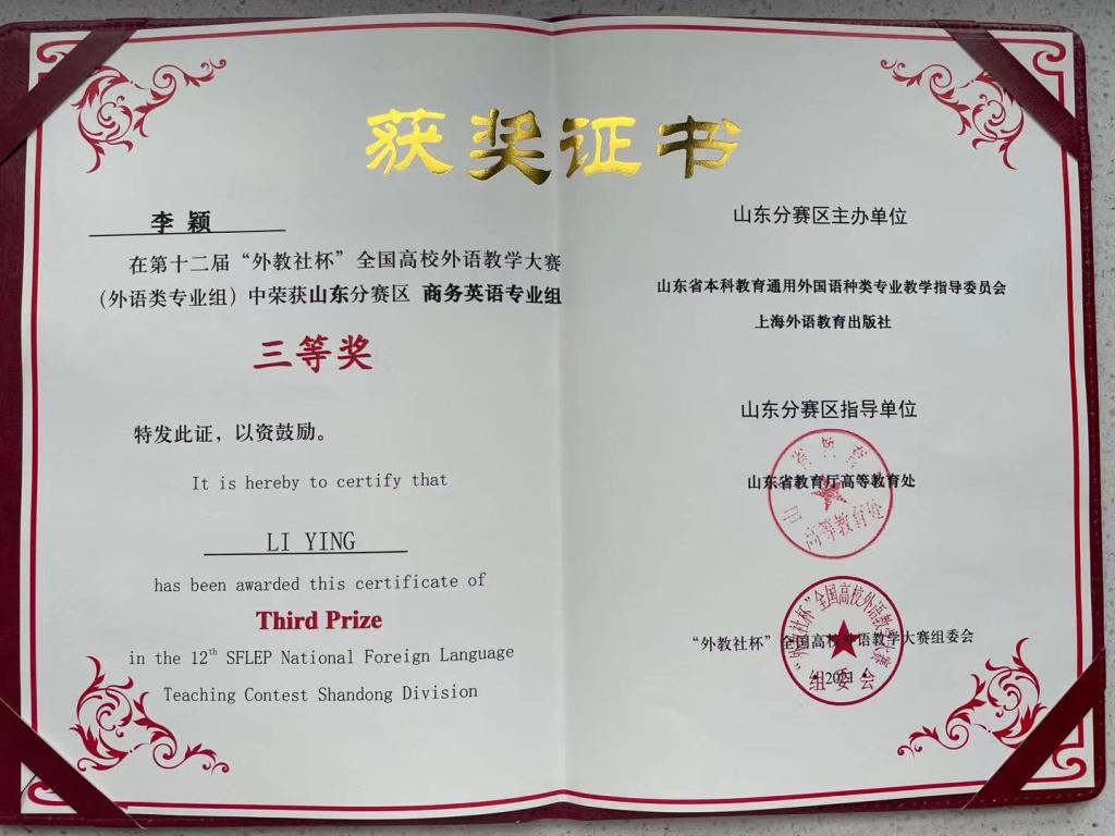 近期,第12届“外教社杯”全国高校外语教学大赛(外语类专业组)山东分赛区结果公布,bwin·必赢(中国区)官方网站-officialswebsi教师李颖获得商务英语专业组三等奖。 本届比赛由山东省教育厅高等教育处指导,山东省本科教育通用外国语种类专业教学指导委员会和上海外语教育出版社联合主办,德州学院承办。比赛分为英语专业组和商务英语专业组两个组别,来自省内48所高校的75位选手参加比赛,充分展示了外语教师优秀的教学技能,发挥了教学示范和引领作用。外国语学院历来重视青年教师培养,注重青年教师教学水平提升。学院将以此次比赛为契机,继续深化教学改革,提升教师教学能力,再创教学新佳绩。(通讯员:迟雯雯)
