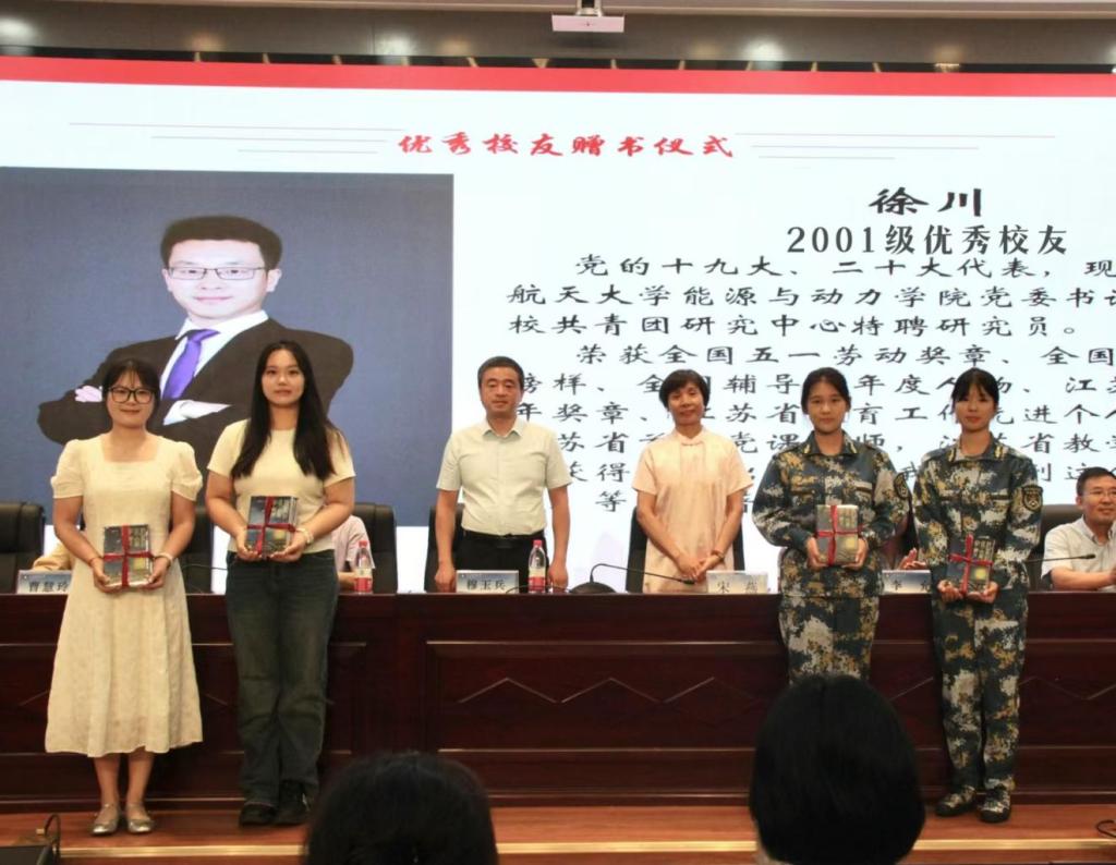 会议精心安排校友赠书仪式。党的十九大、二十大代表,南京航空航天大学能源与动力学院党委书记,英语2001级校友徐川为新生准备个人原创青年励志图书《我们来到这个世界的意义》。学院党委书记穆玉兵、院长宋燕将图书赠予新生手中,鼓励新生向优秀校友看齐,探寻人生意义、找寻人生价值,做新时代的有为青年。