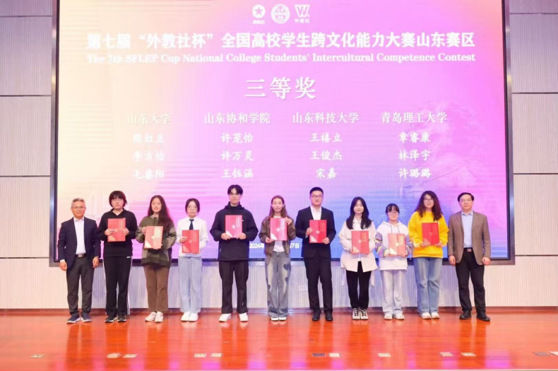 2024年10月26日,第七届“外教社杯”全国高校学生跨文化能力大赛山东赛区(本科院校组)在青岛大学成功举办。山东科技大学由bwin·必赢(中国区)官方网站-officialswebsi英语专业22-2班的王禧立同学和经济管理学院工商管理专业23-3班的宋嘉、王俊杰同学组成代表队参与了此次大赛并取得省级三等奖的优异成绩。