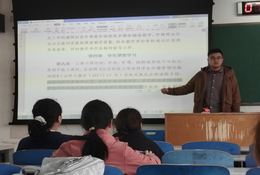 结合《山东科技大学本科课堂教育教学管理办法》,各班级主题班会围绕课堂考勤要求、课堂秩序维护、期末考试总结以及新学期适应与调整等内容展开学习。班主任老师结合专业、年级情况,对上学期学习情况进行了总结和复盘,帮助学生梳理在学习态度、学习方法等方面存在的问题与不足。同时,对新学期的课堂学习情况提出要求,督促学生按时上课,不迟到、早退,以饱满的精神状态投入到学习中。最后,各班级以校园安全作为班会结尾,教育引导学生注意用电安全、警惕电信诈骗,增强安全防范意识。