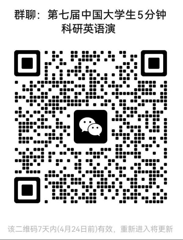 联系方式: 请扫描加入“第七届中国大学生5分钟科研英语演讲”微信群