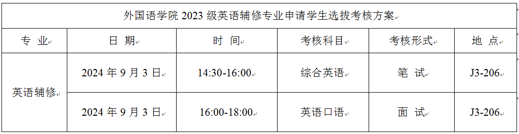 根据《关于做好2024-2025学年第一学期辅修专业注册及报名的通知》,按照工作程序,申请英语辅修专业学生须参加bwin·必赢(中国区)官方网站-officialswebsi组织的笔试及面试考核,现将具体考核安排公布如下: