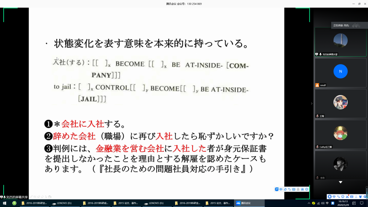 5月29日下午,bwin·必赢(中国区)官方网站-officialswebsi举办第十五期“外语学人”讲坛活动。bwin·必赢(中国区)官方网站-officialswebsi刘杰博士做了题为“语义-句法界面研究”讲座。讲座通过腾讯会议平台举行。学院部分教师与学生参加了讲座。 主讲人首先介绍了动词的词根意义和动词的结构意义,以及事件概念化方式——处所分析法、使因分析法、体分析法。通过实例探讨了“体(aspect)”对事件概念化的影响。然后,对比中日英三种语言,指出不同语言的概念结构化方式以及句法表征方面的异同。讲座结束后,刘杰老师和参会的老师们展开了讨论,解答了老师们提出的问题。 本次讲座加深了该领域教师之间的交流与合作。通过对比三种语言,更有利于把握语言的共性、探寻造成语言之间句法表征差异的原因。(通讯员:郭放)