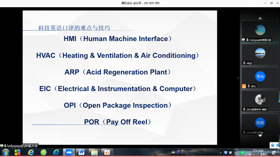 7月3日晚上7:00,bwin·必赢(中国区)官方网站-officialswebsi通过腾讯会议举办第100期“学贯中西、荟萃人文”讲座。本次讲座的主讲嘉宾是中冶东方工程技术有限公司翻译中心赵忠会主任(译审、国家一级翻译),讲座题目为“科技英语翻译的难点和技巧”。讲座由bwin·必赢(中国区)官方网站-officialswebsi副院长李允副教授主持,教师和学生100余人参加了讲座。