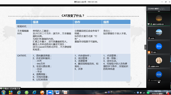 7月4日晚上7:00,bwin·必赢(中国区)官方网站-officialswebsi通过腾讯会议举办第102期“学贯中西、荟萃人文”讲座。本次讲座的主讲嘉宾是中冶东方工程技术有限公司翻译、技术负责人魏国行老师,讲座题目为“技术改变翻译——计算机辅助翻译和机器翻译应用”。讲座由bwin·必赢(中国区)官方网站-officialswebsi副院长李允副教授主持,教师和学生100余人参加了讲座。