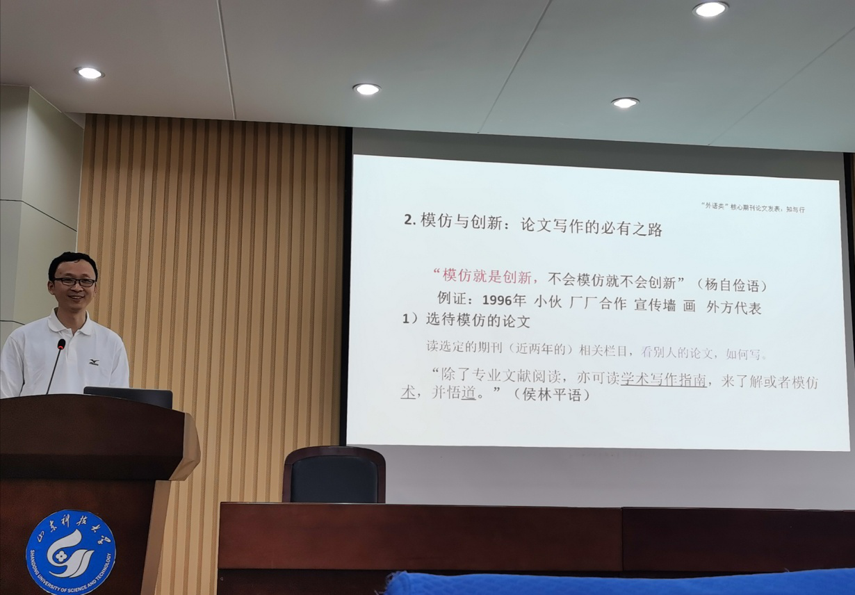 侯林平老师以“‘外语类’核心期刊论文发表:知与行”为题,从经验与文献、模仿与创新以及投稿与退修三方面系统阐述论文选题的法宝、论文写作的必有之路以及论文投稿的注意事项。
