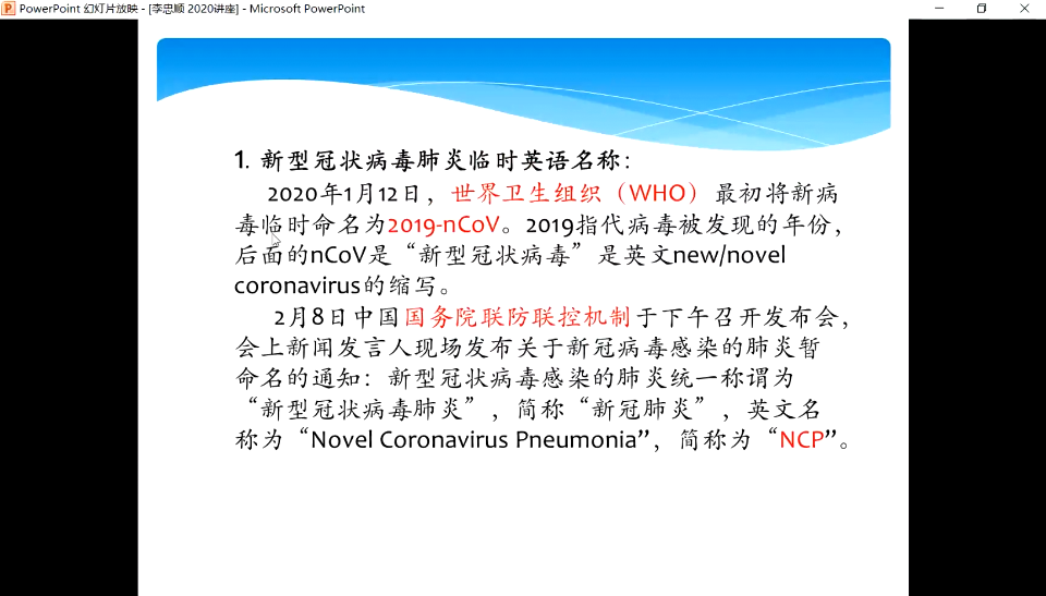 李老师从新冠肺炎临时英语名称入手,首先回顾了其正式英语名称确立的过程,随后,分析并解读了新冠肺炎正式英语名称确立为COVID-19的语言学依据和重要意义。李老师指出,新型冠状病毒肺炎正式英语名称是依据语言“规约性”原则确立的。李老师还详细介绍了中国专家在新型冠状病毒命名过程中提出的异议,以及人类传染病正式名称命名不当可能引发的各种潜在问题。李老师强调,正式的命名可以尽量减少疾病名称对贸易,旅行、旅游或动物福利的不必要负面影响,并避免对任何文化、社会、国家、地区、专业或民族全体造成冒犯。最后,李老师同与会师生进行了交流和讨论。