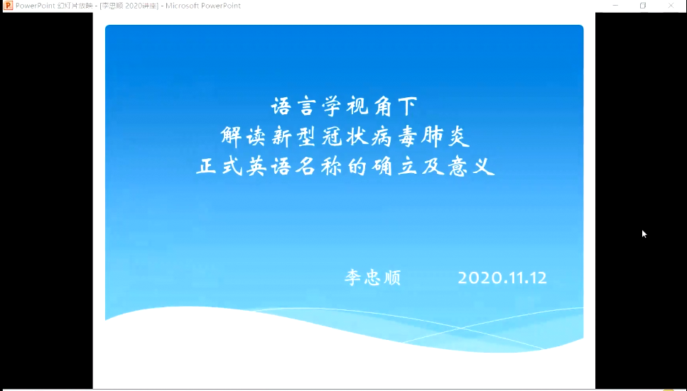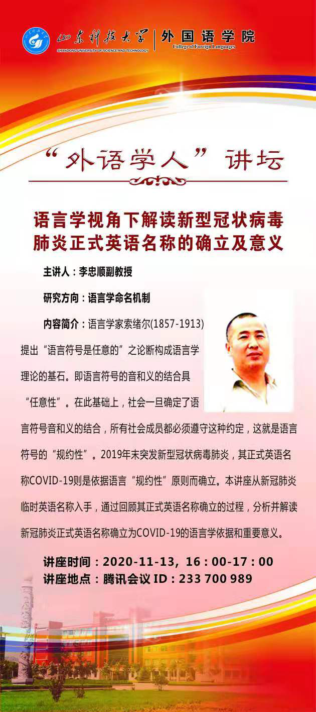 11月13日16点,bwin·必赢(中国区)官方网站-officialswebsi通过腾讯会议平台举办第二十二期“外语学人”讲坛活动。bwin·必赢(中国区)官方网站-officialswebsi李忠顺副教授做了题为《语言学视角下解读新型冠状病毒肺炎正式英语名称的确立及意义》的精彩讲座。本次讲坛由李允副院长主持,学院部分师生参加了讲坛。