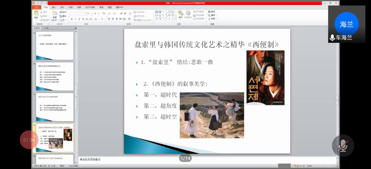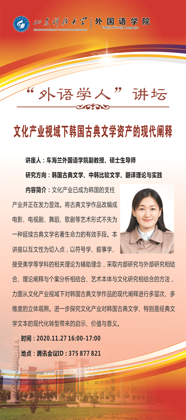 11月27日,bwin·必赢(中国区)官方网站-officialswebsi通过腾讯会议平台举办第二十四期“外语学人”讲坛活动。bwin·必赢(中国区)官方网站-officialswebsi副教授车海兰做了题为《文化产业视域下韩国古典文学资产的现代阐释》的精彩讲座。讲座由朝鲜语系主任刘霞主持,学院部分师生参加讲坛。