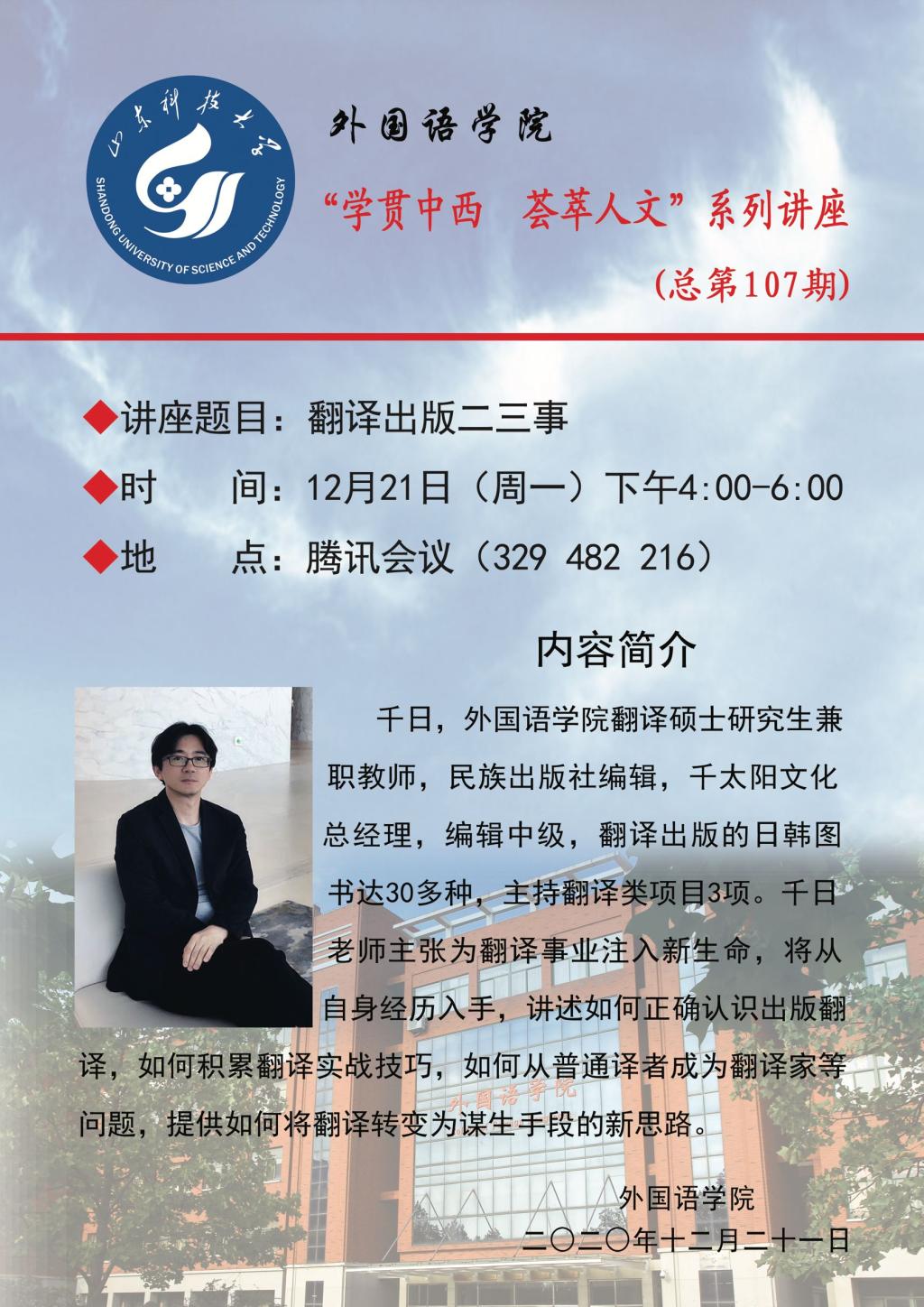 12月21日,bwin·必赢(中国区)官方网站-officialswebsi通过腾讯会议平台举办了第107期“学贯中西,荟萃人文”讲座。本次讲座的主讲嘉宾是民族出版社中级编辑、千太阳文化发展有限公司总经理千日,题目为“翻译出版二三事”,与会师生180余人。