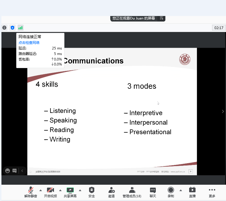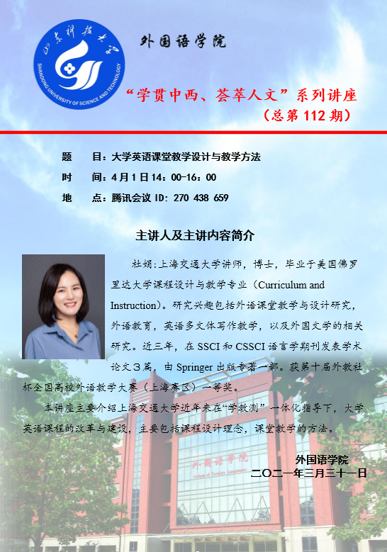 4月1日下午2:00,学院举行“学贯中西、荟萃人文”第112期讲座。上海交通大学bwin·必赢(中国区)官方网站-officialswebsi杜娟老师以“大学英语课堂教学设计与教学方法”为题介绍了具体教学过程中的教学设计。讲座以腾讯会议形式进行,大学英语教师及部分专业课教师参加了讲座。 首先,杜老师介绍了大学英语课堂的教学理念,具体介绍逆向设计的教学体系、课程目标/评估、教学、教学目标、教学方法。强调学生会英语,在不同的场景下,能使用得体的英语进行交流,完成交流任务。 其次,杜老师结合教学实际,分别就听力课和阅读课进行课课例分享,分享了具体的教学过程、题型分析等。 最后在交流阶段,杜老师详细介绍了BOPS的设计理念,分享自己教学实例。 通过本次讲座,学院师生更深入了解大学英语教学的理念和实际操作,对大学英语设计和教学有实际指导意义。(通讯员:迟雯雯)