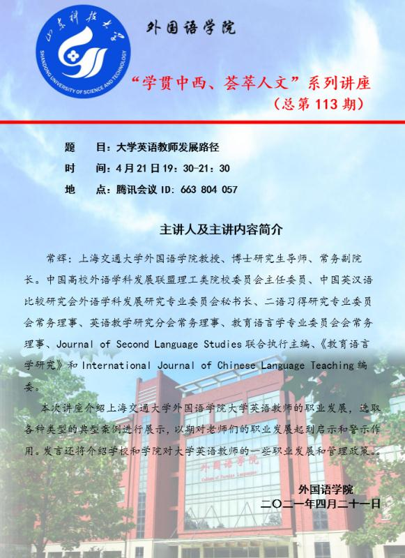 4月21日晚19:30,学院举行“学贯中西、荟萃人文”第113期讲座。上海交通大学bwin·必赢(中国区)官方网站-officialswebsi常辉教授介绍了外语教师的职业发展路径。讲座以腾讯会议形式进行,我院大学英语教师及部分专业教师参加了讲座。