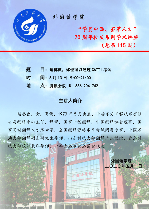5月13日晚19:00,bwin·必赢(中国区)官方网站-officialswebsi举办70周年校庆系列学术讲座——第115期“学贯中西、荟萃人文”活动。本次讲座特邀中冶东方工程技术有限公司翻译中心主任(译审)赵忠会担任主讲。讲座以腾讯会议线上形式进行,由副院长李允主持,bwin·必赢(中国区)官方网站-officialswebsi部分教师及全体硕士研究生参加。