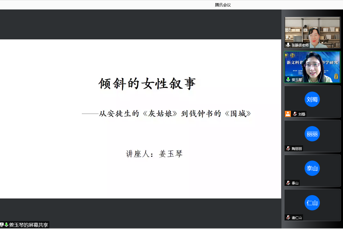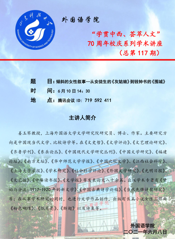 6月10日下午,bwin·必赢(中国区)官方网站-officialswebsi通过腾讯会议举办了70周年校庆系列学术讲座——第117期“学贯中西、荟萃人文”活动。本次讲座特邀上海外国语大学文学研究院姜玉琴教授主讲。本次讲坛由英语系张静波教授主持,学院部分师生参加。