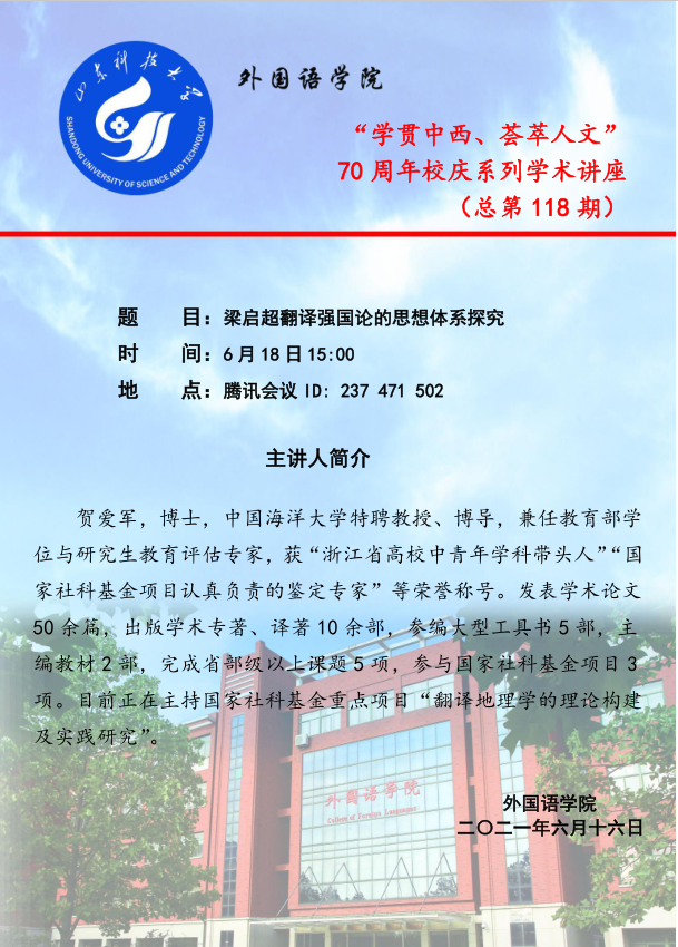 6月18日下午3:00,bwin·必赢(中国区)官方网站-officialswebsi举办70周年校庆系列学术讲座——第118期“学贯中西、荟萃人文”活动。本次讲座特邀中国海洋大学bwin·必赢(中国区)官方网站-officialswebsi贺爱军教授为我院师生做了“梁启超翻译强国论的思想体系探究”讲座。本次讲坛由英语系侯林平教授主持,100多位师生在线聆听,受益匪浅。
