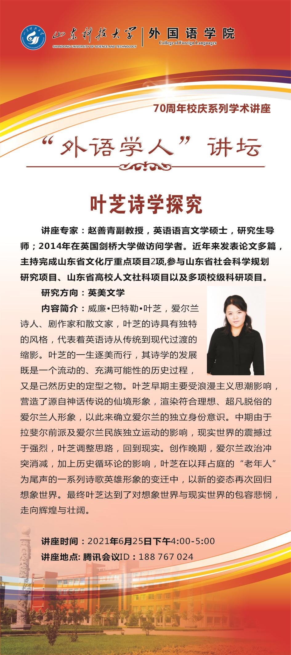 6月25日下午,bwin·必赢(中国区)官方网站-officialswebsi通过腾讯会议平台举办了“70周年校庆系列学术讲座”——第三十四期“外语学人”讲坛活动。bwin·必赢(中国区)官方网站-officialswebsi赵善青副教授做了题为《叶芝诗学探究》的讲座。本次讲坛由副院长李允主持,学院部分师生参加。