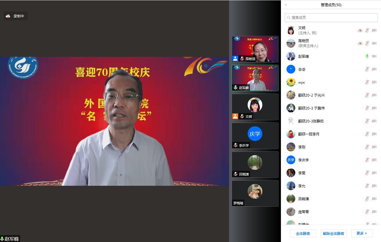 在山东科技大学70周年校庆来临之际,外语学院举办系列学术讲座献礼校庆,为教师和学生献上丰盛的精神盛筵。作为系列讲座的第一讲,9月22日上午由研究生院(部)主办、bwin·必赢(中国区)官方网站-officialswebsi承办的2021年第97期“名家讲坛”在腾讯会议平台上如期举行。