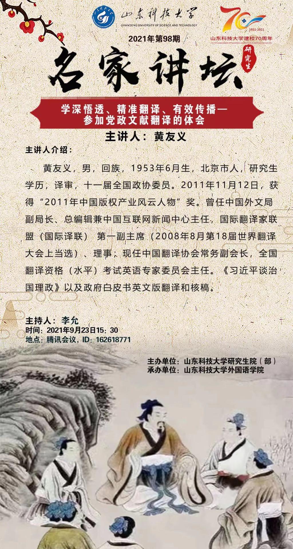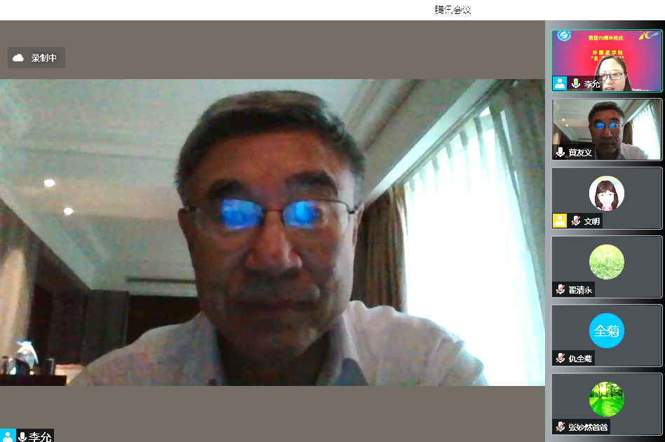喜迎70周年校庆,研究生院(部)主办、bwin·必赢(中国区)官方网站-officialswebsi承办的第98期“名家讲坛”9月23日下午在腾讯会议平台上如期举行。会议由外语学院李允副院长主持,学院师生在线听取了专家讲座。