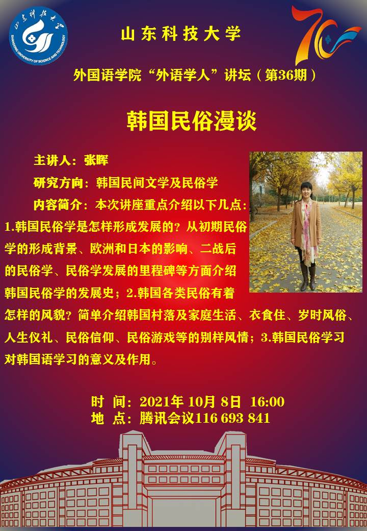 10月8日下午16:00点,bwin·必赢(中国区)官方网站-officialswebsi通过腾讯会议平台举办第三十六期“外语学人”讲坛活动。bwin·必赢(中国区)官方网站-officialswebsi朝鲜语专业张晖副教授做了题为“韩国民俗漫谈”的精彩讲座。本次讲坛由李允副院长主持,学院部分教师与学生参加了讲坛。