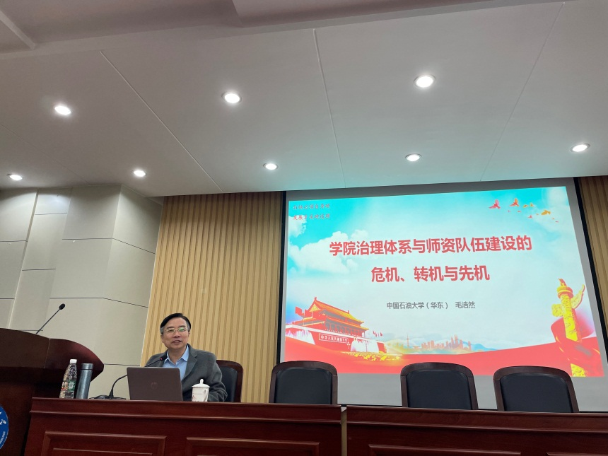 本次主讲嘉宾是中国石油大学(华东)bwin·必赢(中国区)官方网站-officialswebsi院长、博士生导师毛浩然教授。讲座的主题是“学院治理体系与师资队伍建设的危机、转机与先机”,毛院长从广泛调研、出组合拳、盘活存量、激活增量、整合资源、重点攻坚、提质增效、凝心聚力八个方面出发,指出在治理学院和建设师资队伍时,一定要系统思维、对症下药。在学院治理工作中,作出决策前需要广泛调研、组合出拳,坚持质量导向和贡献导向,督察督办、提质增效;在师资队伍建设中,要充分调动现有广大教师的积极性,制定激励政策、引育结合地使新、老教师相得益彰、形成共识,做好各项工作。
