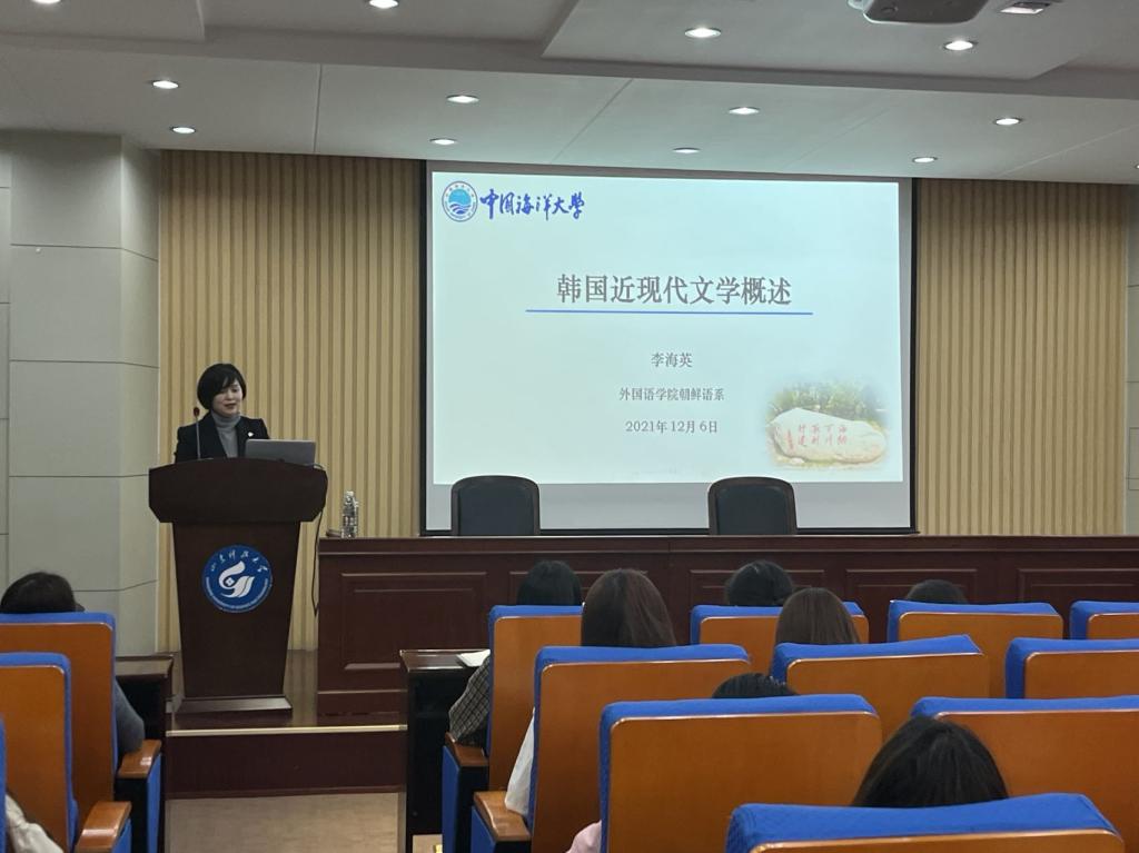 本次主讲嘉宾是中国海洋大学教授、博士生导师、韩国研究中心主任李海英教授,讲座的主题是“韩国近现代文学概述”。郑教授以李光洙、廉想涉、李萁永、韩雪野、朴泰远、崔仁勋等韩国近现代著名作家及其代表作品为例,对韩国近现代文学的发展轨迹做综述式介绍,并且对韩国近代女性作家进行谱系梳理。 提问环节,师生与李教授就韩国文学发展的过程进行探讨,气氛热烈。此次讲座,使与会人员对近现代韩国文学的发展脉络有了整体的认识,为文学研究提供了新的思路,激发了师生对韩国文学和韩语学习的兴趣。(通讯员:刘文明)