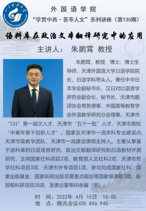 4月15日下午,bwin·必赢(中国区)官方网站-officialswebsi2022年第135期“学贯中西·荟萃人文”讲座在腾讯会议平台举办。本次讲座由bwin·必赢(中国区)官方网站-officialswebsi副院长李允主持,学院师生代表参加了讲座。 本次讲座的主讲嘉宾为天津外国语大学日语学院院长、博士生导师朱鹏霄教授,讲座主题为“语料库在政治文本翻译研究中的应用”。首先,朱鹏霄教授讲述了语料库的类型与发展历程以及语料库的建设途径,然后重点围绕日语语料库阐释了其应用领域和进行课题研究的具体方法,最后与参会师生热切交流并提供宝贵建议。 本次讲座的研究方法和研究视角使与会师生深切体会到运用语料库研究文本翻译的优势,拓宽了师生的研究领域和研究视野,激发了师生对于语料库研究的思考和探索。(通讯员:刘杰)