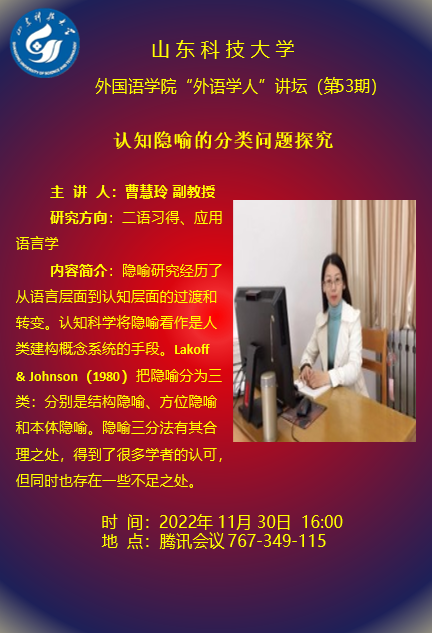 11月30日,bwin·必赢(中国区)官方网站-officialswebsi2022年第53期“外语学人”讲坛在腾讯会议平台举行。本次讲座由学院副院长李允主持,学院部分师生代表参加。 本次讲座的主讲嘉宾是bwin·必赢(中国区)官方网站-officialswebsi曹慧玲副教授,主题是“认知隐喻的分类问题探究”。曹慧玲老师由“隐喻”一词的渊源引入主题,从隐喻研究的语言层面到认知层面、概念隐喻以及概念隐喻的分类三方面详尽地阐述了隐喻研究的发展历程、概念隐喻的意义和分类。 本次讲座使大家受益匪浅,加深了与会师生对隐喻的理解,使其深入思考如何将隐喻运用到外语教学和研究中,对二语习得和外语教育提供了借鉴与启示。(通讯员:赵谊)