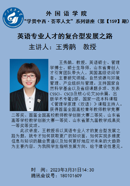 3月31日,bwin·必赢(中国区)官方网站-officialswebsi以线上形式开展了2023年第159 期“学贯中西·荟萃人文”系列讲座。本次讲座由英语系主任王明亮老师主持,bwin·必赢(中国区)官方网站-officialswebsi部分师生参加。 本次主讲嘉宾是山东农业大学公共管理学院王秀娟教授,本次讲座的题目是“英语专业人才的复合型发展之路”。王秀娟教授就如何扩展专业知识面、整合多维信息和知识,以及应对未来趋势的方法等方面分享了宝贵经验。 本次讲座开阔了学生们的视野,令与会师生受益匪浅。(通讯员:赵小达)