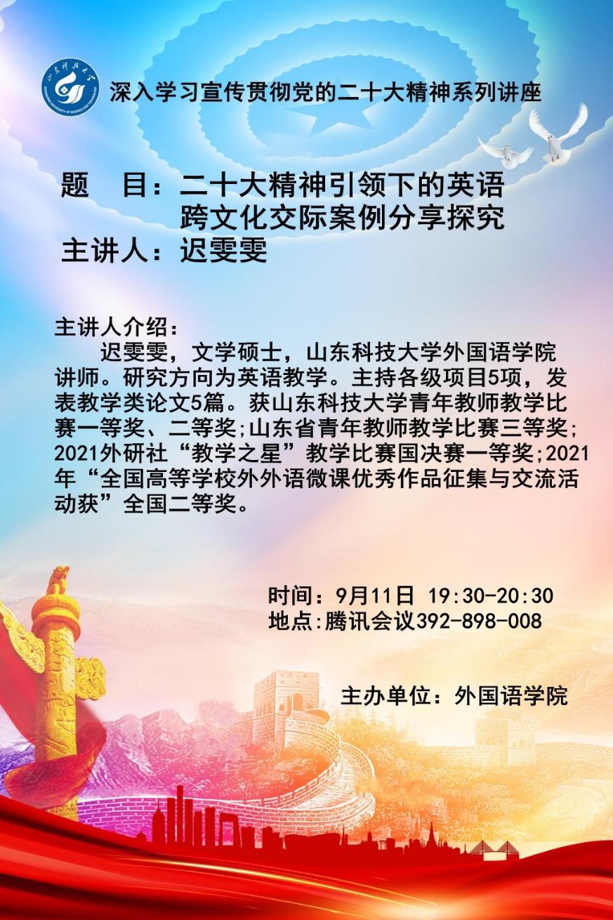 为响应校宣传部“深入学习宣传贯彻党的二十大精神系列讲座”,同时解决学生热点关注问题,2023年9月11日,迟雯雯老师线上为同学们分享题为“党的二十大精神引领下的英语跨文化交际案例分享探究”的讲座与交流,学生积极参加。