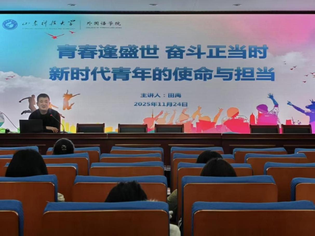 田禹结合外语学科的专业特色与发展定位,系统阐述了新时代青年的历史使命与国家发展、民族复兴之间的内在联系。他通过引用优秀校友实例,深入解读国家发展战略对外语人才的时代要求,强调青年学子必须坚定理想信念,夯实专业基础,全面提升综合素养。他指出,外语专业学生要立足学科优势,深耕专业能力,在跨文化沟通与国际传播实践中积极讲好中国故事,主动服务国家发展大局。现场氛围热烈,互动频繁。