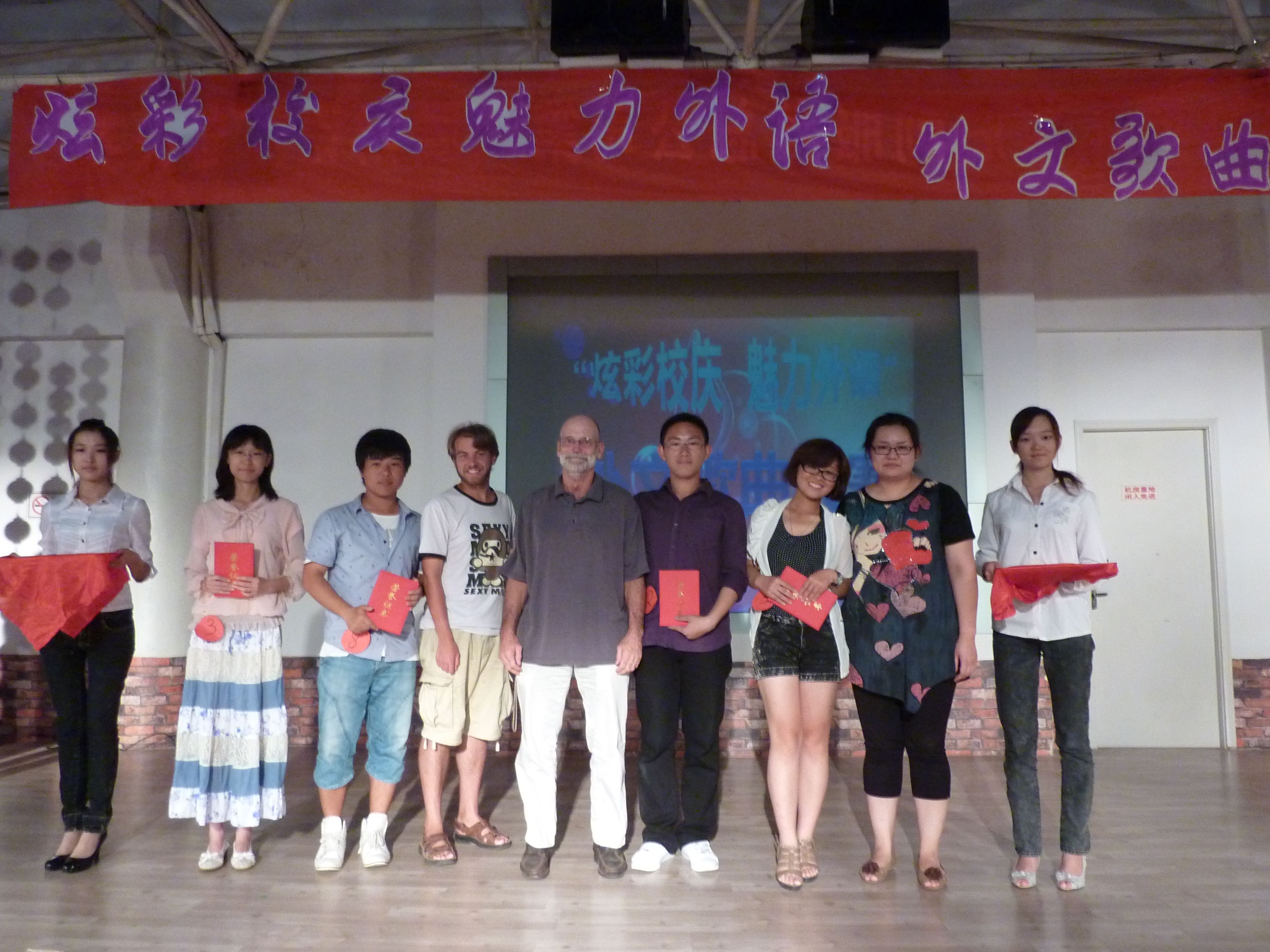 经过评选,获得一等奖的是7号选手张方舟,获得二等奖的是4号选手孟小月、6号选手吴巧曼和9号选手李梅宝、张琪,获得三等奖的是1号选手方星、2号选手孟令阳、3号选手庄娟和8号选手董国庆。获得最佳人气奖的是2号选手孟令阳,获得最佳台风奖的是8号选手董国庆,获得最佳外文发音的是7号选手张方舟。嘉宾评委们分别为获奖选手颁奖,并与他们合影留念。( 通讯员:麻慧)