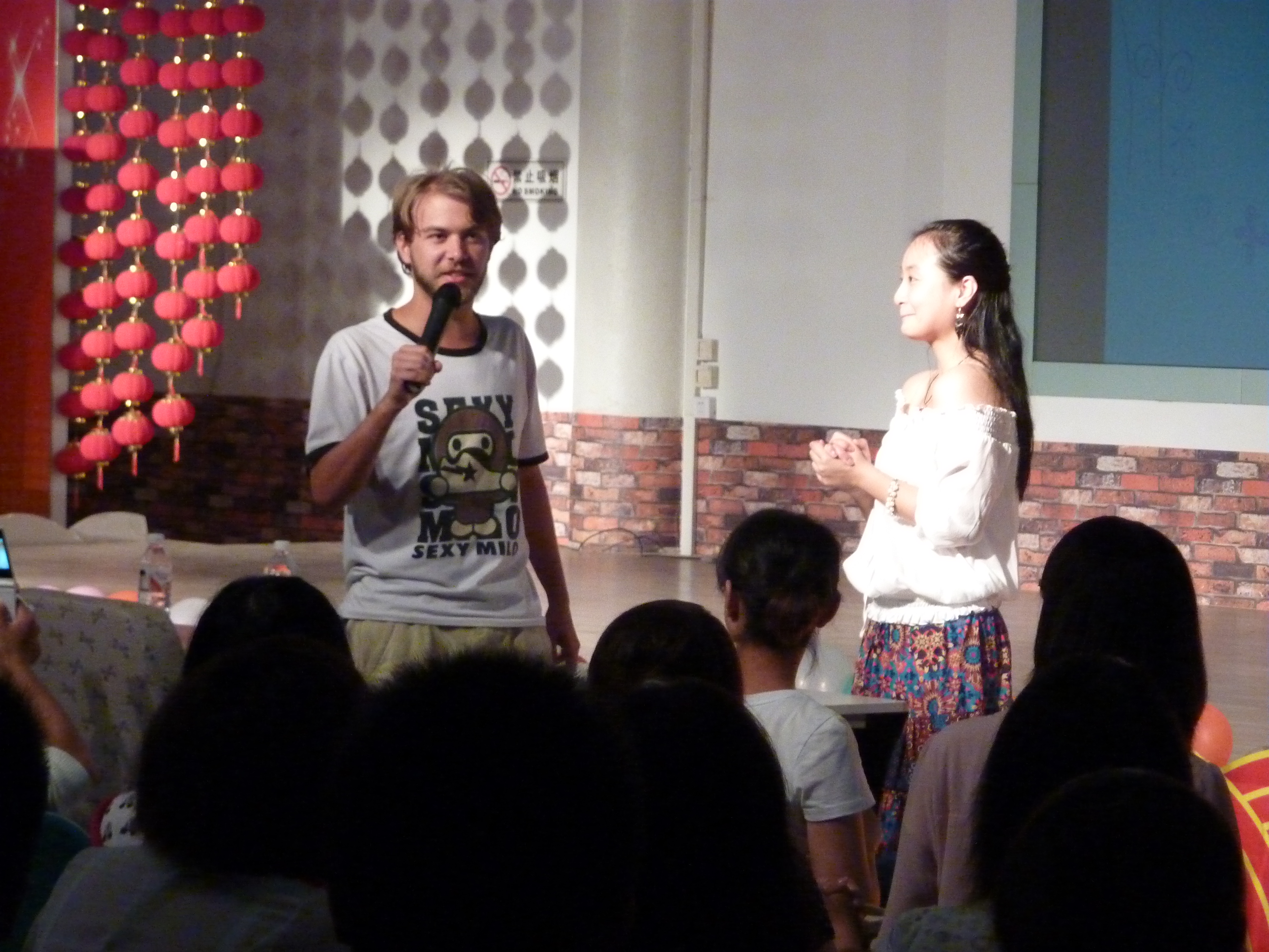 本次外文歌曲大赛共分为三个环节:有备演唱、“帮帮唱”和“猜猜看”,共有9组参赛选手。无论是有备演唱还是与他们搭档的“帮帮唱”,选手们都表现的从容自若,同时也将自己的情感展现的淋漓尽致,观众们欢呼声一片,掌声不断。在“猜猜看”游戏环节中,每位选手都积极抢答,观众们更是跃跃欲试,现场气氛极其热烈。中场期间,主持人采访了两位外教和几名现场的同学,外教们表示对此次外文歌曲大赛很满意,期望大家最后能够取得好成绩,Luke还为大家演唱了一首中文歌曲,赢得同学们的阵阵掌声。现场的同学说,虽然中秋节不能和父母一起度过,但是和大家在一起却依旧感觉很温馨、很幸福,并祝愿父母中秋快乐,身体健康。最后,在徐慧老师一曲优美的法语歌曲《玫瑰人生》中,此次外文歌曲画上了圆满的句号。