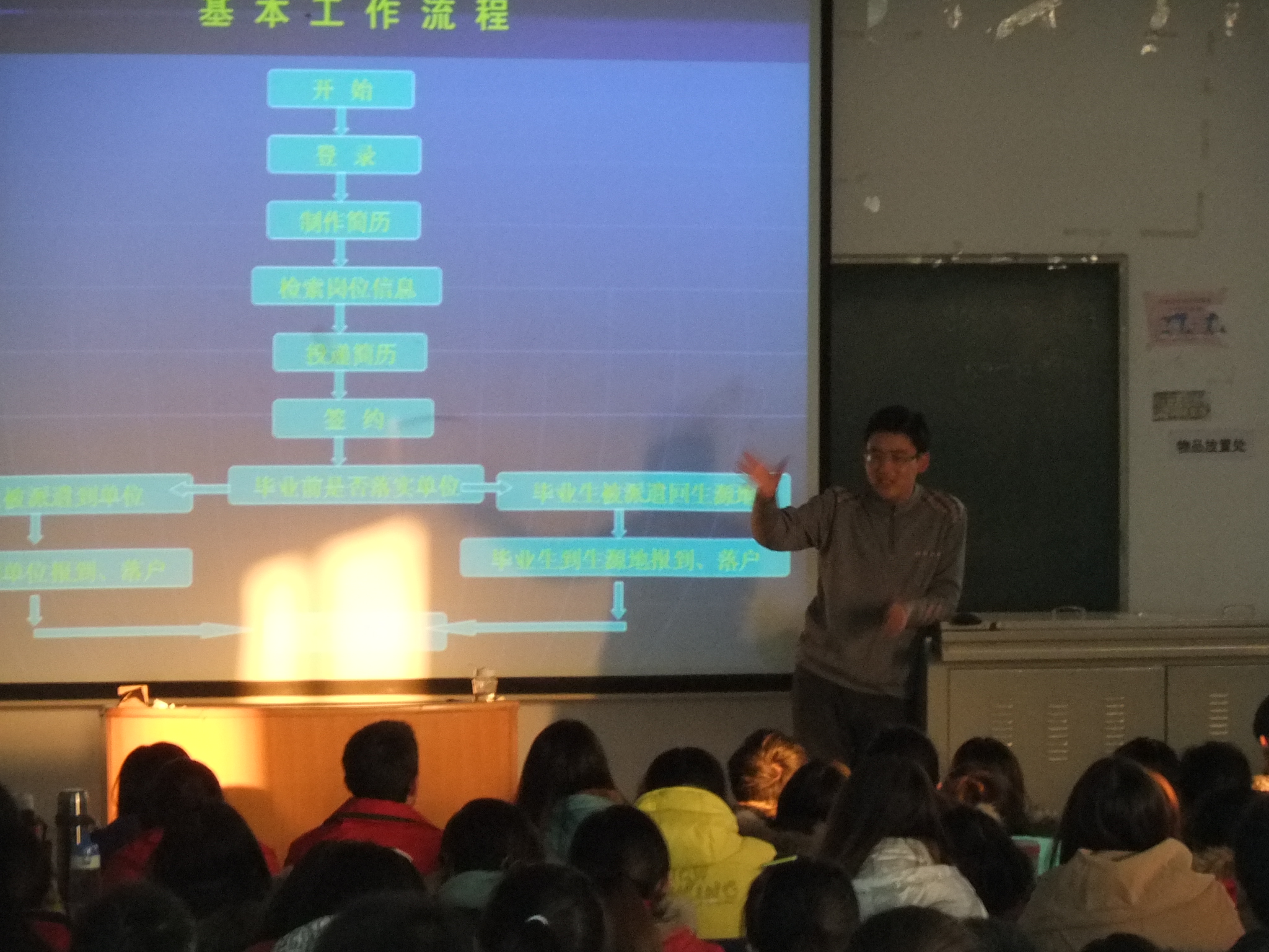 刘亮亮首先为全体毕业生讲解了“工作的基本流程”,并详细就其中简历投送、辨别招聘信息真伪、面试竞争就业、合理安排工作事项等方面进行了讲解。同时,就大学生存在的就业误区,就业难问题作出深刻的分析与系统的指导。之后又结合幻灯片演示,为同学们具体示范了如何正确使用就业信息系统。老师的讲解诙谐幽默,同学们的提问积极踊跃,讲座气氛热情洋溢,同学们受益匪浅。