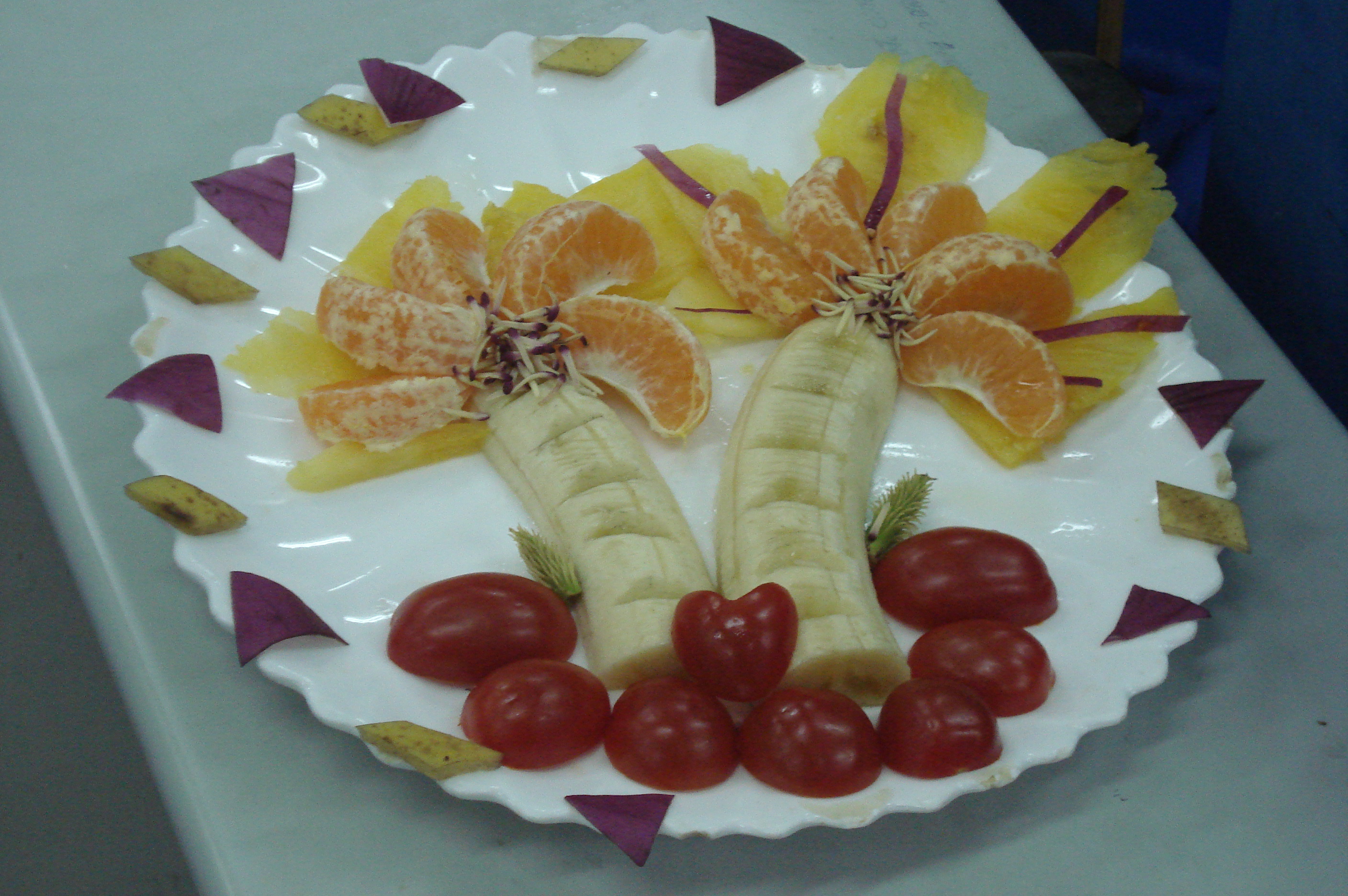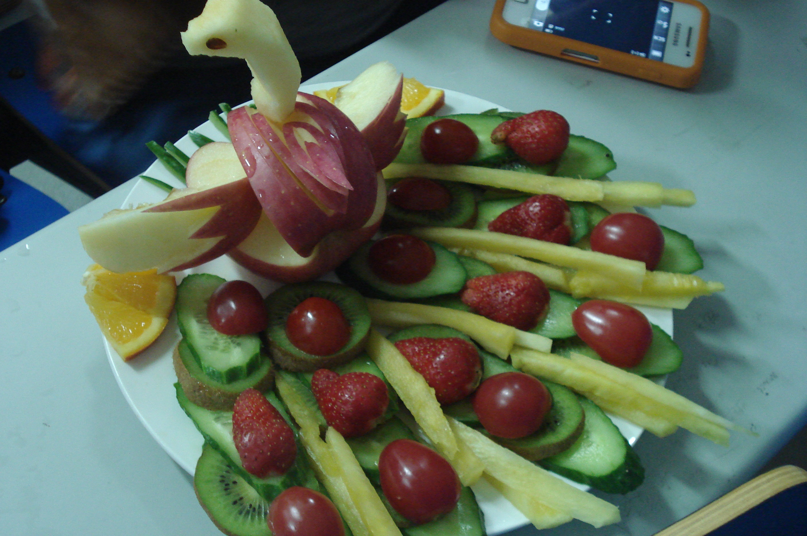 本次比赛共分为三个环节,首先进行的是外院小巧手—削苹果比赛,每队派出一名队员进行比赛,主要考察选手的刀工,最终以用时短、作品好为优。第二环节为水果拼盘,每组选手需在有限时间和限量水果的条件下,通过团队合作,赋予作品无限的生命力。此环节主要比拼的是创意,美观度,很多选手别出心裁制作的水果拼盘色香味俱全,让人垂涎欲滴。拼盘完成后,选手需要给自己的作品起一个名字,解释其设计概念。这是最吸引人眼球的一个环节,选手们都积极开动脑筋,群策群力,最终一盘盘精美的水果拼盘展现在大家的眼前,让人垂涎欲滴。最后一个环节是知识竞答,题目主要涉及一些果蔬知识、饮食安全等,让同学们在欢乐的气氛中学到了很多实用性的知识。