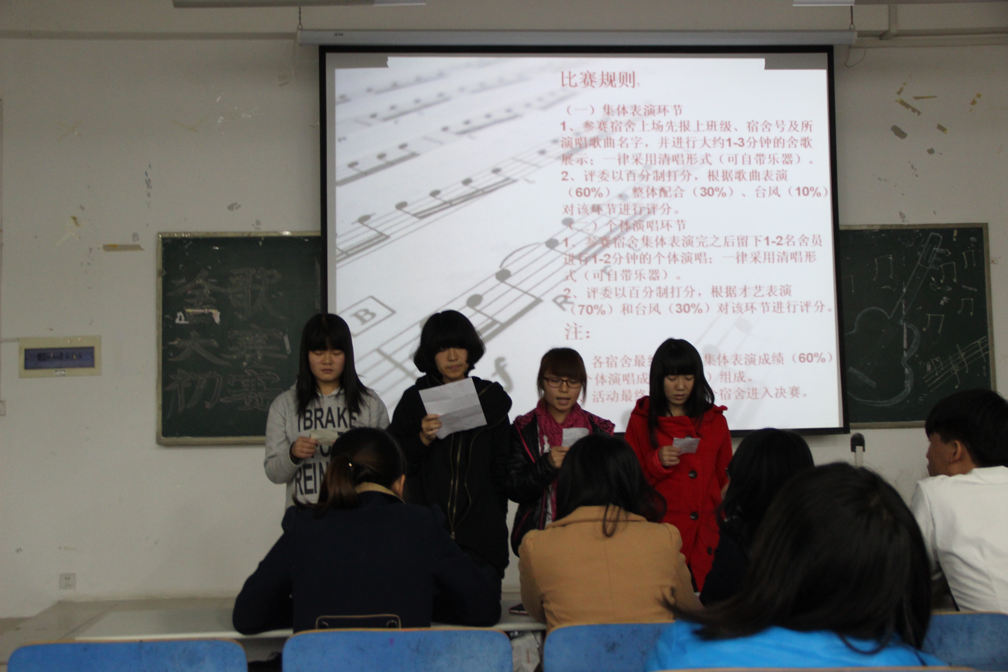 本届舍歌大赛共分为集体表演和个体演唱两个环节,最终成绩由集体表演的60%和个体演唱的40%组成。在集体表演环节中,宿舍成员们手拉手走向舞台,大声喊出自己的口号,唱出自己的青春宣言,传达友谊万岁的心声。个体演唱环节中,各宿舍代表们充分了展示了自己的才艺和特长,积极为宿舍争取荣誉。最终共有12个宿舍进入决赛。