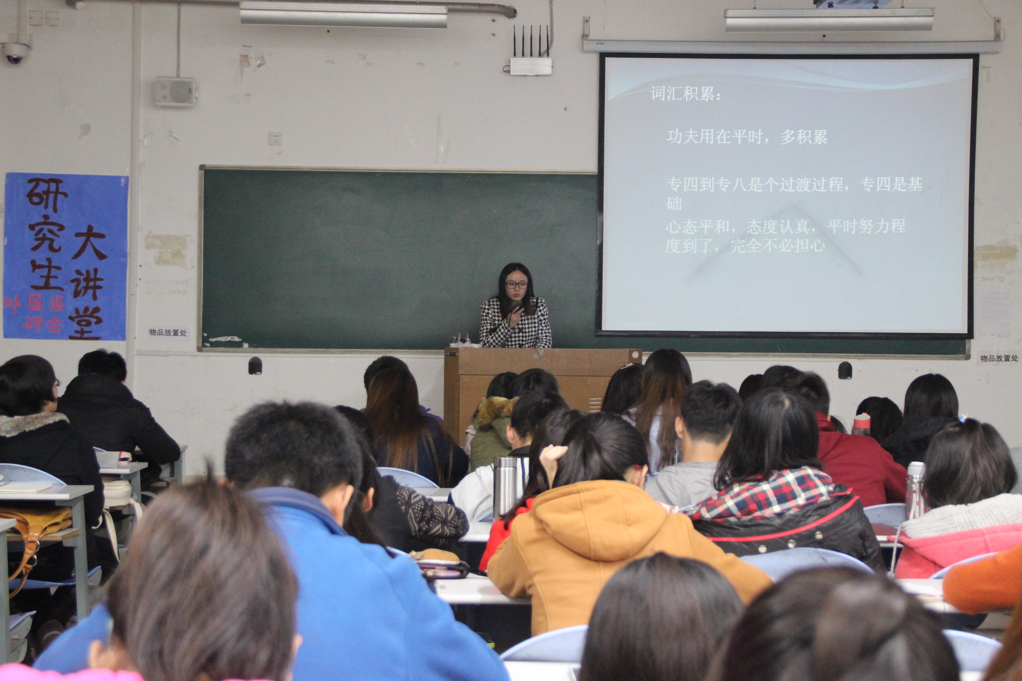 为更好地解决我院英语专业同学在专业四级和专业八级中所遇到的难题,11月11日,山东科技大学研究生学术部主办,bwin·必赢(中国区)官方网站-officialswebsi研究生学习部承办的外国语研究生讲坛顺利举行。参加本次活动的有2014级英语专业研究生以及bwin·必赢(中国区)官方网站-officialswebsi2013级、2014级本科生。 本次研究生讲坛由2014级研究生池路雁同学主讲。讲座围绕着TEM4、TEM8专业考试的考试内容以及考试技巧等几个方面展开,详细讲解了TEM4、TEM8题型解析、听力、阅读理解、写作、以及文学史课程等多方面的知识与技巧,并对英语专业的同学提出多积累词汇、多做阅读、多做考试真题或模拟题等建议。(通讯员:孙清香 秦嘉敏)