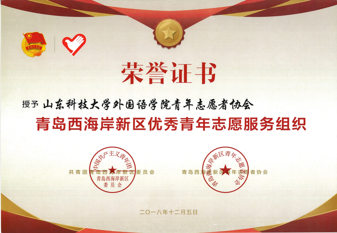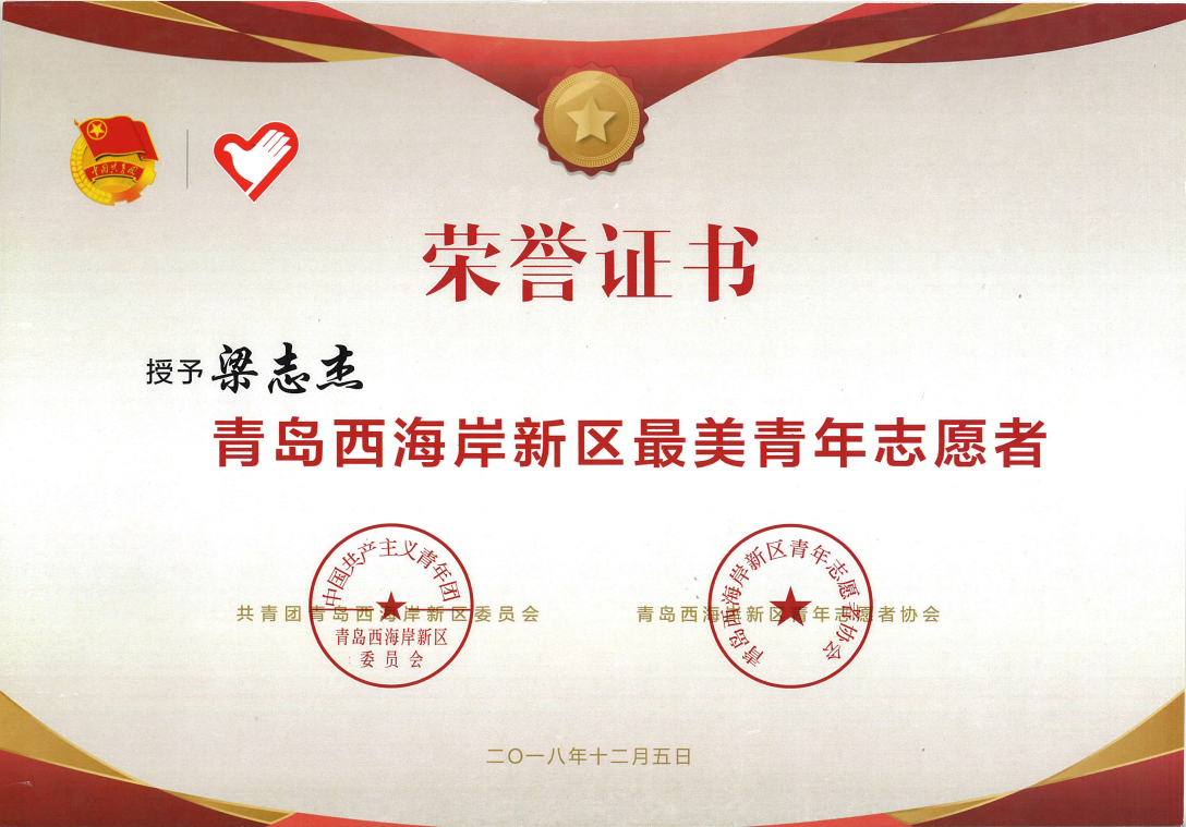 在共青团青岛西海岸新区委员会组织开展的2018年最美青年志愿者、优秀青年志愿者、优秀青年志愿服务组织、优秀青年志愿务项目评选活动中,我院青年志愿者协会获“青岛西海岸新区优秀青年志愿服务组织”;梁志杰、姜鲁静获“青岛西海岸新区最美青年志愿者”。