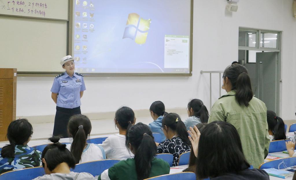 苗警官从交通事故对人的伤害讲起,并强调了普及交通安全知识的必要性。她从学生道路安全切入,图文结合,具体地讲解了三方面内容。一、正确走路。她强调要走人行道,集中注意力,不要戴耳机听音乐或者玩手机,不要随意翻越护栏。二、正确骑自行车。她强调不要在机动车道上骑行,转弯时要伸手示意,不要骑车带人、追逐竞技、脱手撒把等,还为同学们展示了大型车辆的视野盲区,提醒同学们远离大型车辆转弯时的内侧区域。三、正确乘车。苗警官通过一些交通事故视频清晰直观地为同学们呈现了如何正确使用安全带以及不系安全带的可怕后果。苗警官现场教授了常用的交通标志意义和常用交警手势,并与提出问题的同学们进行积极互动。最后,苗警官提出交通事故离同学们并不遥远,并举出了几例发生在周边的事故,希望同学们引以为戒。