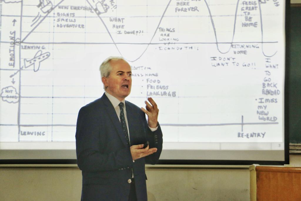 首先,外教Logor做了简短的自我介绍,并以轻松幽默的方式点出了本次讲座的主题“Culture Shock and Adaptation”。为了使同学们进一步了解英语文化,外教Logor通过放映PPT、讲述经历、分享故事等多种形式突出本次讲座的主题。之后,他还分别从文化的定义出发,在社会关系、肢体语言、价值观等方面带领同学们认识了中外文化冲击,介绍了自己在经历这些文化冲击的切身感受,使同学们对文化的差异性有了更加直观的感受。他幽默诙谐的语调以及生动活泼的动作使同学们听得津津有味,现场气氛活跃,不时响起阵阵掌声。Logor还分享了让同学们能更加深入了解文化差异的视频,使现场气氛走向高潮。随后,Logor分析了文化差异带来的影响以及人们面对文化差异时心理的变化情况。最后,外教Logor分享了自己的心得体会,他鼓励同学们试着去了解文化差异,并且战胜文化差异带来的影响,以积极的心态去适应世界,以美好的心态去拥抱未来。