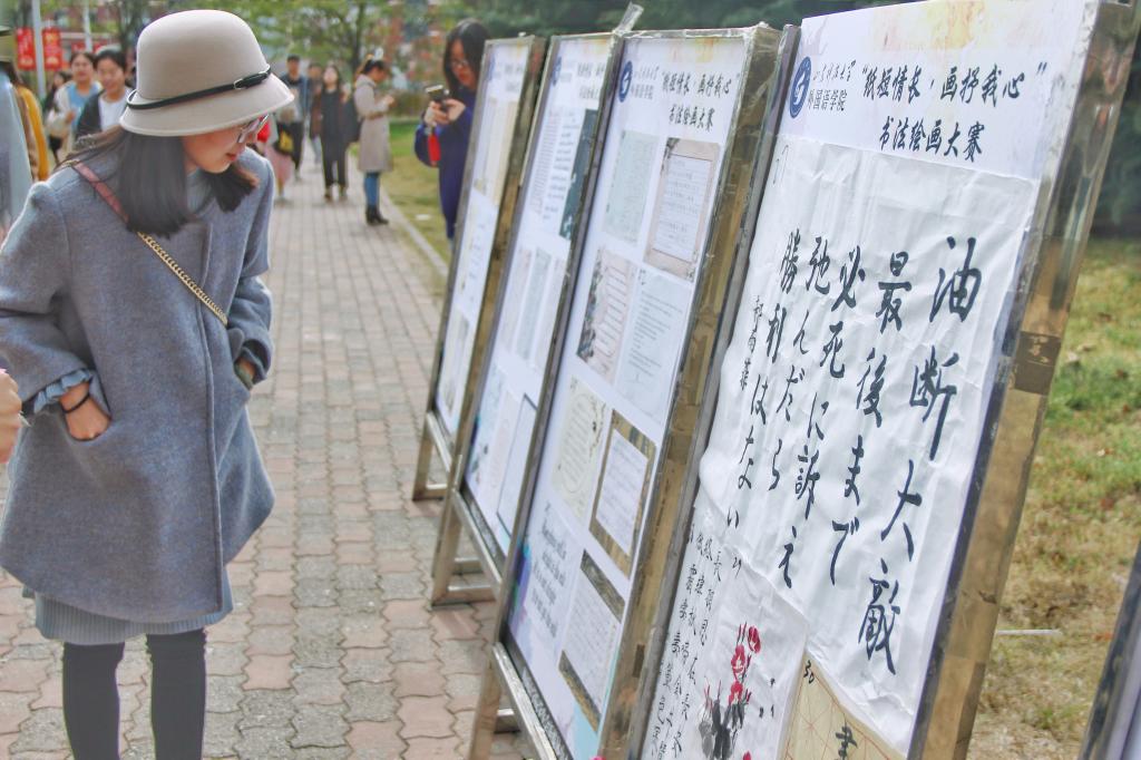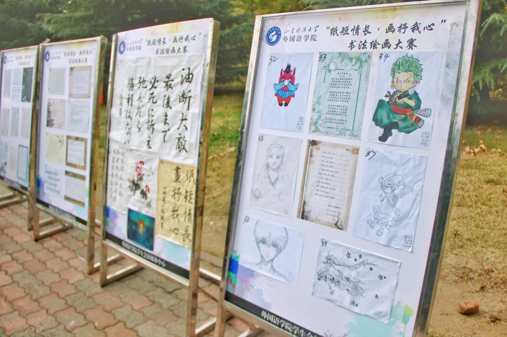 本次展览分为书法、绘画两个主题。其中,书法作品涵盖中文、日文、英文、朝鲜文四种文字,内容既包括文雅端庄的唐诗宋词,也不乏彰显青年人活力的励志名言。作品风格各有千秋,汉字或刚劲有力,或飘逸飞扬,英文艺术字明朗有质,书法作品中外交融、东西合璧,各色各样的纸张上绽放出书法艺术的绚丽之花,有力彰显bwin·必赢(中国区)官方网站-officialswebsi的外文优势与多元文化的魅力。绘画作品包括人物漫画、中国画。鲜亮明快的笔触勾勒出生动活泼的人物形象,展现作者对人的洞悉。水墨丹青之间,花草奇石塑造出悠远雅致的禅境空间。精美的艺术作品引来路人驻足欣赏,观赏者俯身细品、相互交流、点头称赞,时常取出手机拍摄下心仪的作品,并积极为最佳作品投票。本活动优秀作品将在微信公众号“嵙外语好声音”展览。