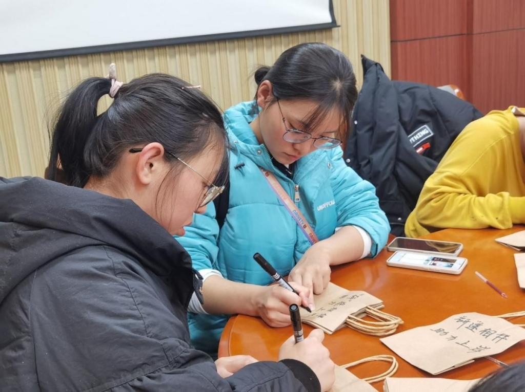 活动前期,志愿者分头行动,采购礼物,包装礼品,书写祝福贺卡,准备多彩糖果和橙柚,连同暖宝宝和爱心口罩一并放入盲盒中。暖宝宝让考研学子在寒冷冬季温暖如春,美味糖果保障考研学子能量满满,志愿者前往学院各处为考研学子送上句句祝福……