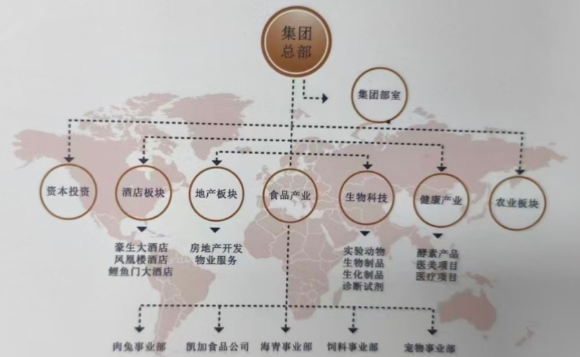集团总部→集团部室;集团总部延伸出资本投资、酒店板块(豪生大酒店、凤凰楼酒店、鲤鱼门大酒店)、地产板块(房地产开发、物业服务)、食品产业(肉兔事业部、凯加食品公司、海青事业部、饲料事业部、宠物事业部)、生物科技(实验动物、生物制品、生化制品、诊断试剂)、健康产业(酵素产品、医美项目、医疗项目)、农业板块。