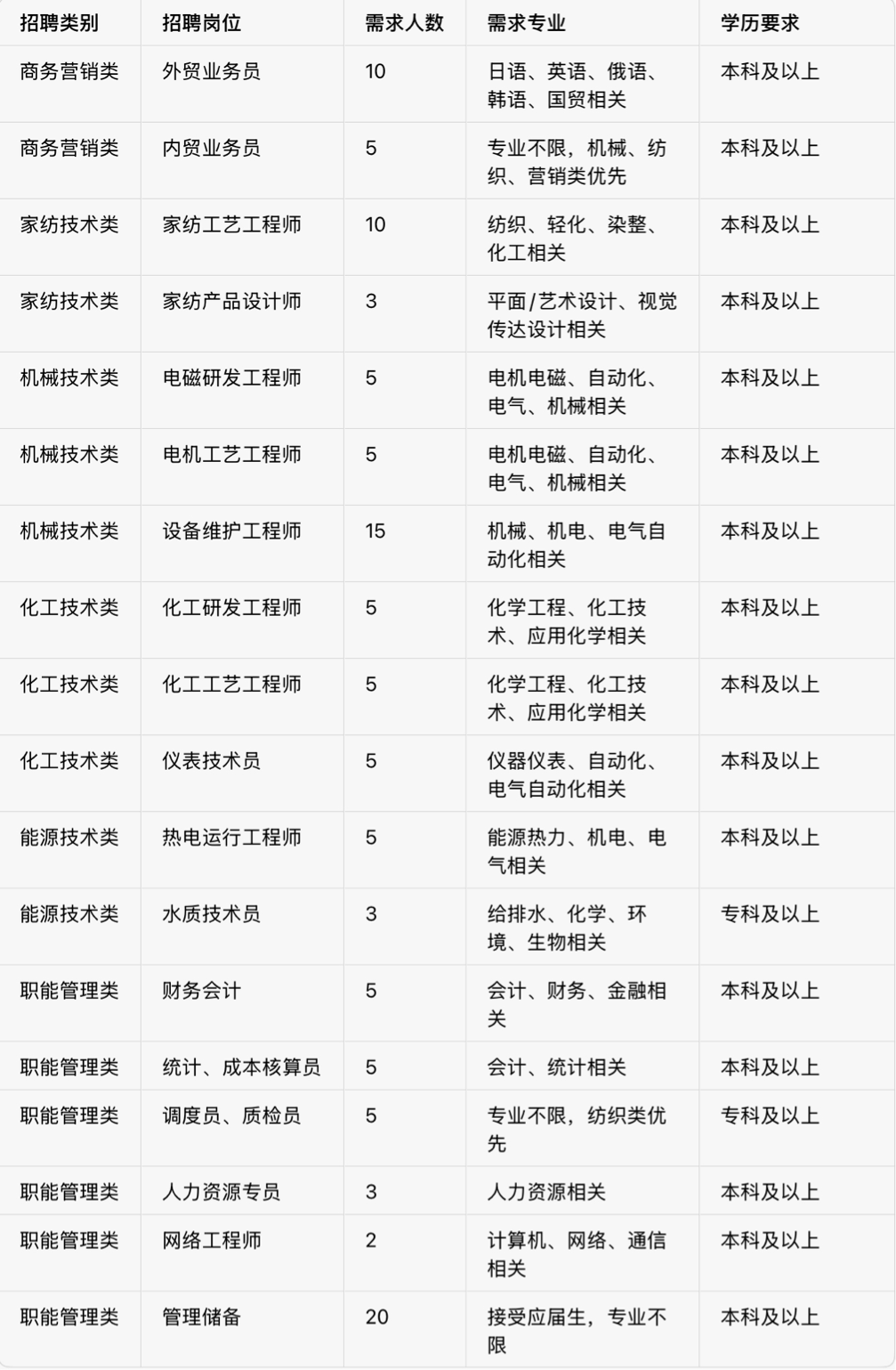 3. 生活福利:配备市内班车,每个厂区有4D标准化餐厅;职工子女可优先享受孚日学校优质教育(含孚日幼儿园、小学、中学);配备医保定点资质的一级综合职工医院。