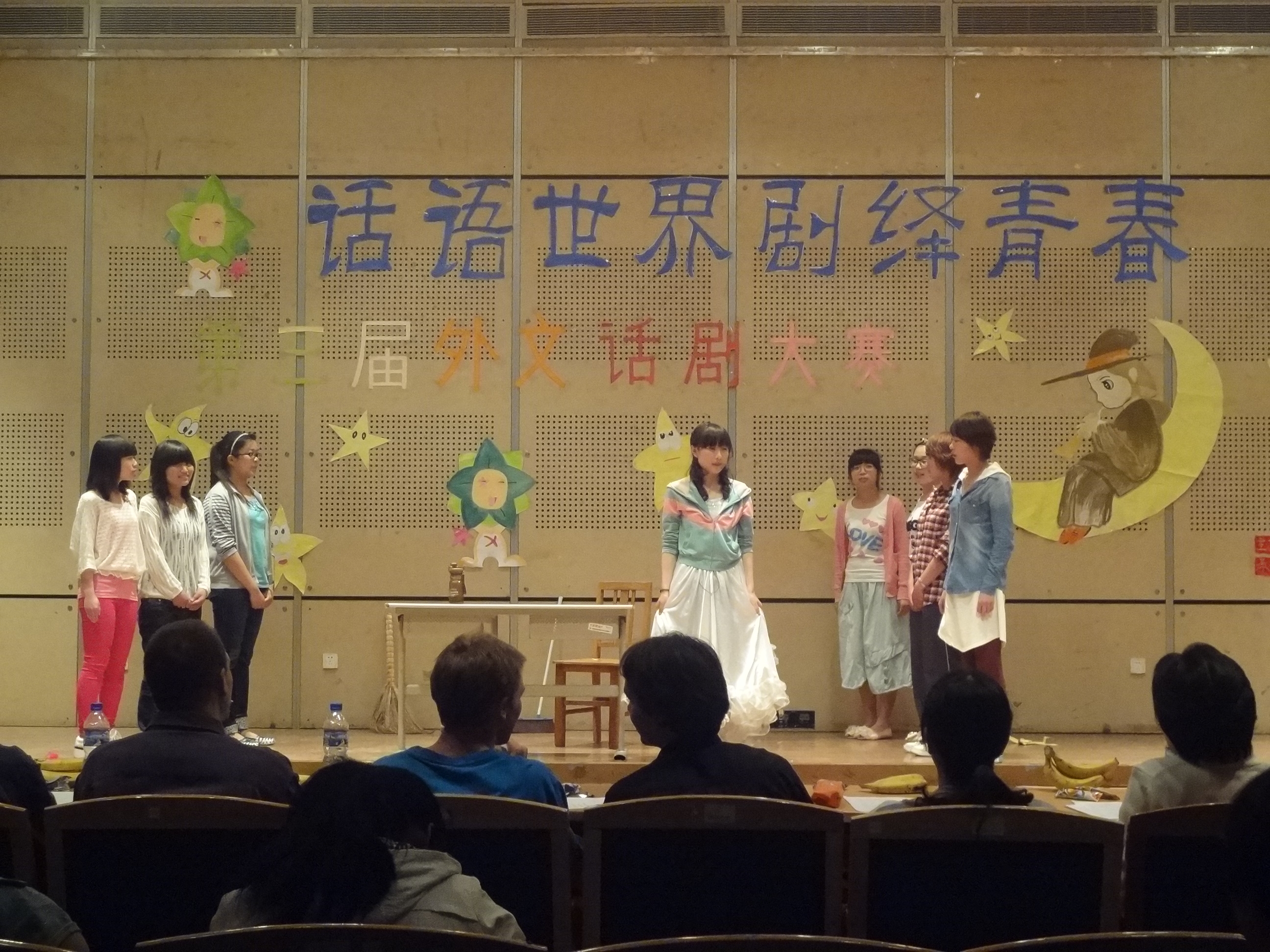 本次外文话剧大赛分为英语组和日语组,既有依据经典故事改编的幽默剧,又有诠释亲情的温馨剧。其中,英语2011-4班和英语2011-2班分别将经典故事《白蛇传》和《梁祝》重新改编搬上舞台,其夸张的肢体动作和丰富的面部表情,赢得了在场观众的阵阵喝彩。由英语2011-6班带来的《恋爱事件》以另类方式阐释了邻里关系,别出心裁地融入了歌舞表演,展现了同学们较高的表演能力和想象力。日语2011-2班的话剧《我爱你》以其独特的视角展示了对母爱的理解。