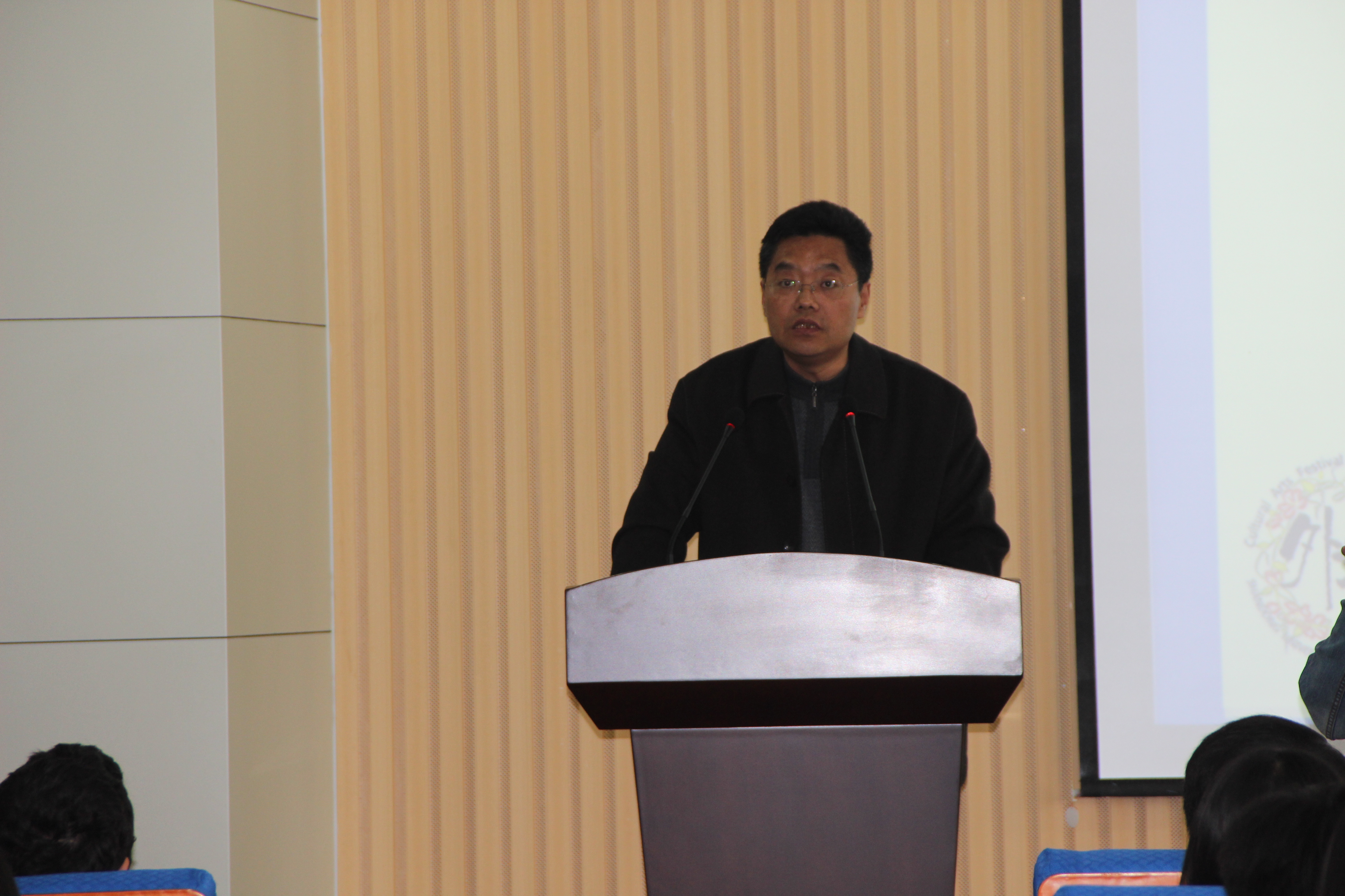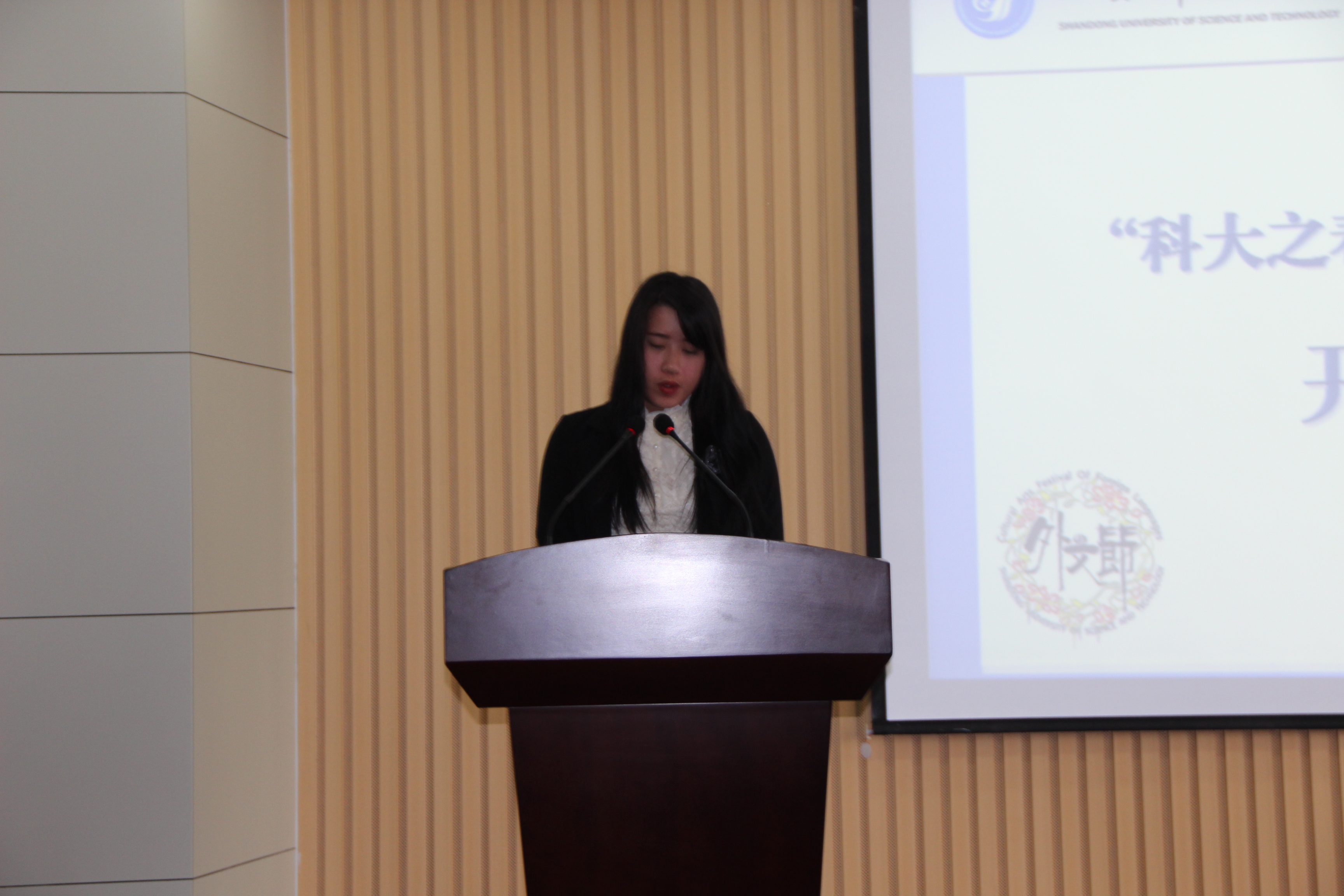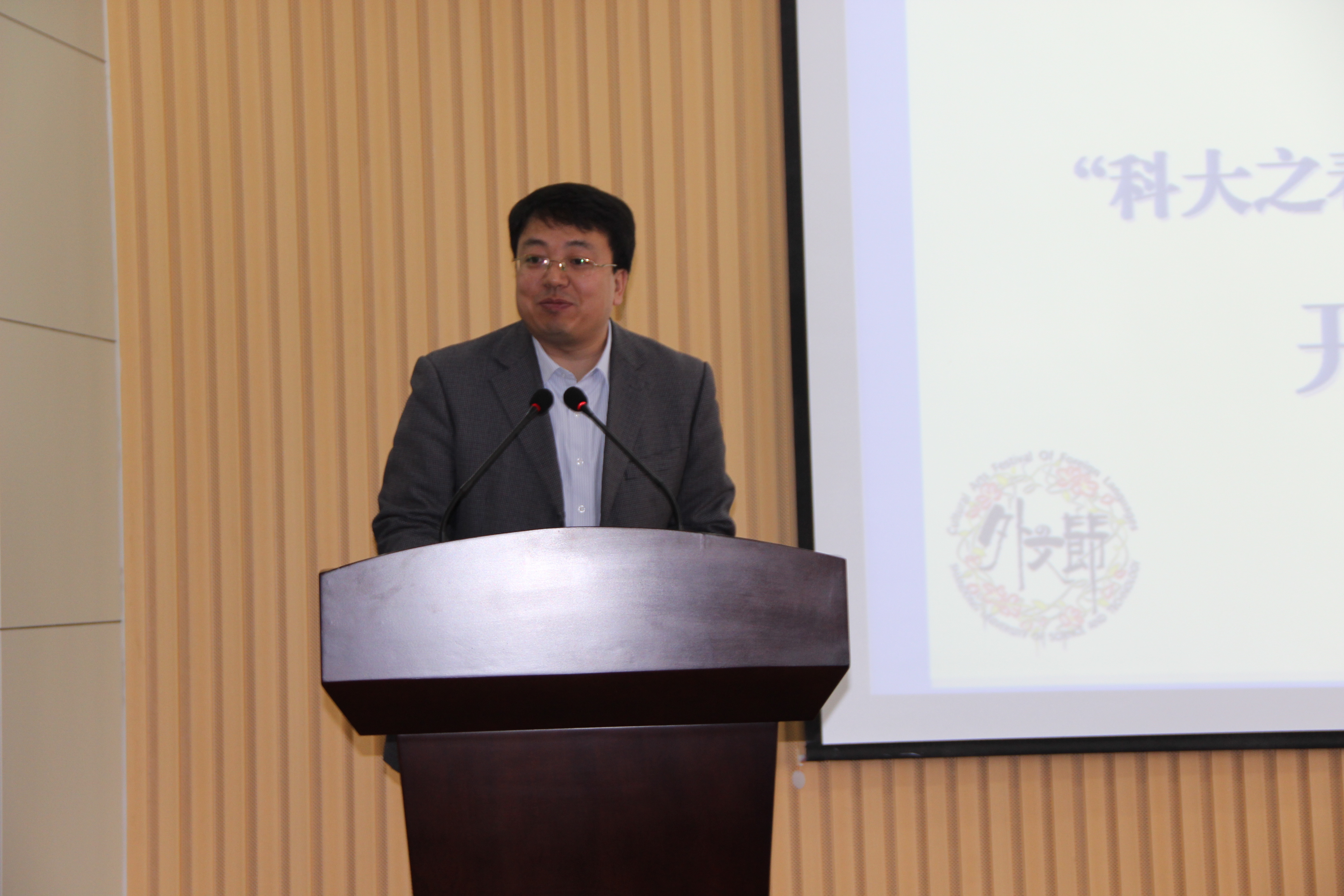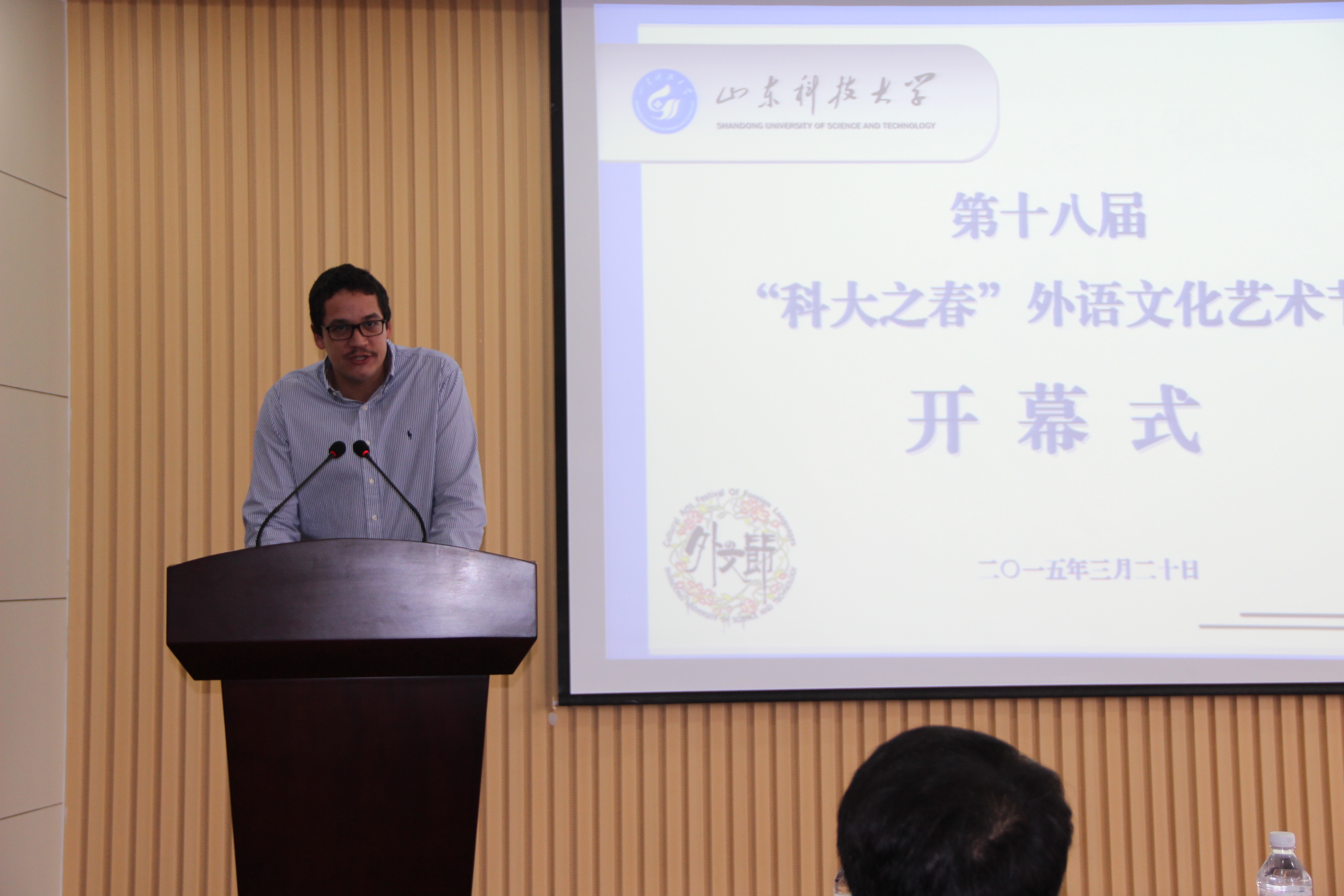 学校有关部门、学院领导出席“外文节”开幕式 学院党委书记李双立讲话并宣布“外文节”开幕 校团委副书记郝亮宣读本届“外文节”活动方案 学院党委副书记兼副院长马海超主持开幕式 外教 Martin 发言 院学生会主席高小鑫发言